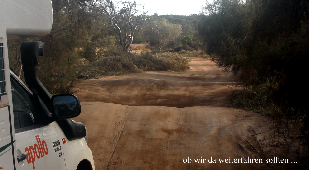 Kurz vor 6.00 h wachten wir auf. Wieder standen wir sofort auf und fuhren um 6.15 h los zu einer kleinen Erkundungsfahrt. Zunächst fuhren wir ein Stück am Murchison River entlang. |