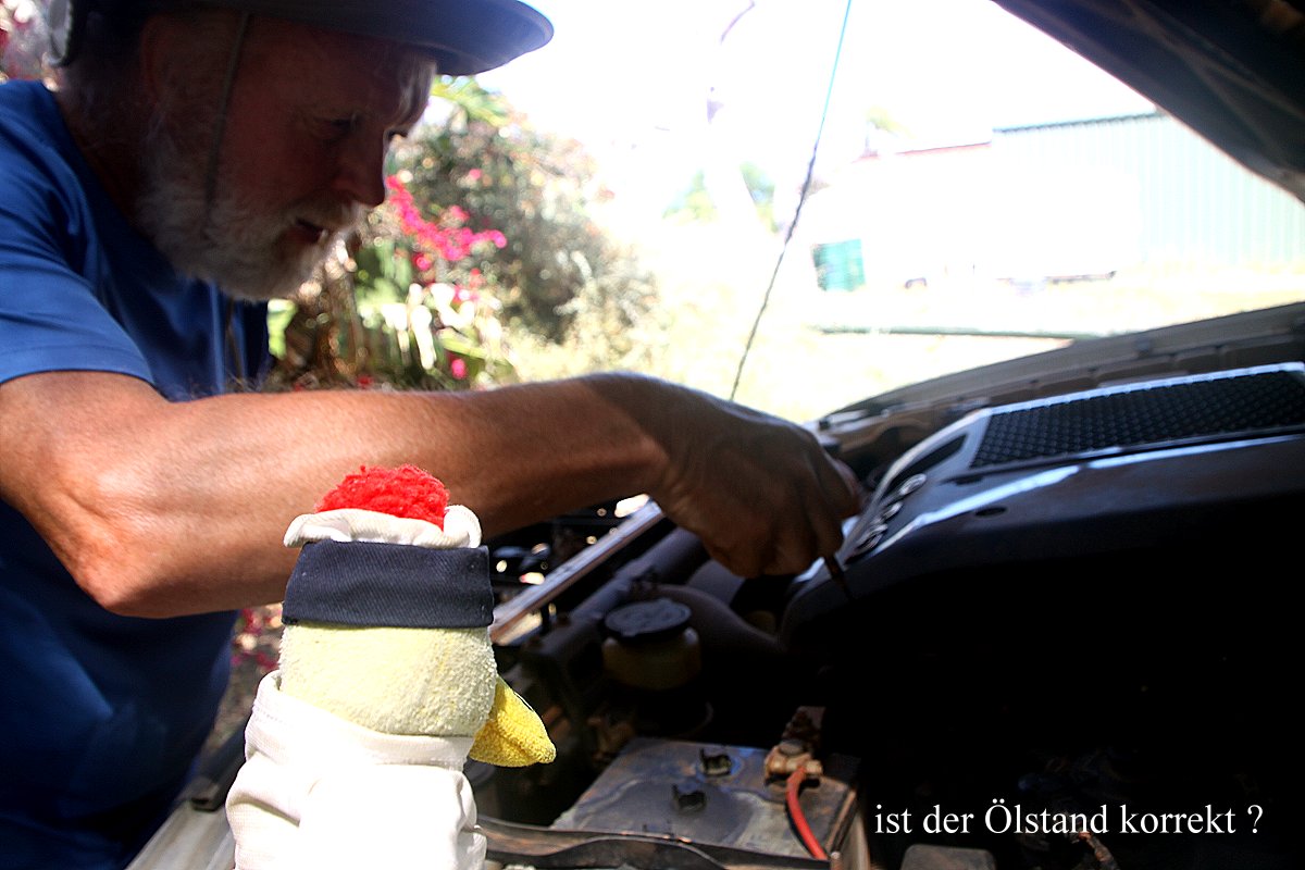 Um 8.45 h kamen wir wieder beim Caravan-Park an und machten Frühstück. Inzwischen war der Himmel wieder strahlend blau, kein Wölkchen mehr zu sehen. Um 10.00 h waren wir startbereit. Bevor wir losfuhren, überprüfte ich mit Entelchen nochmals den Ölstand. |