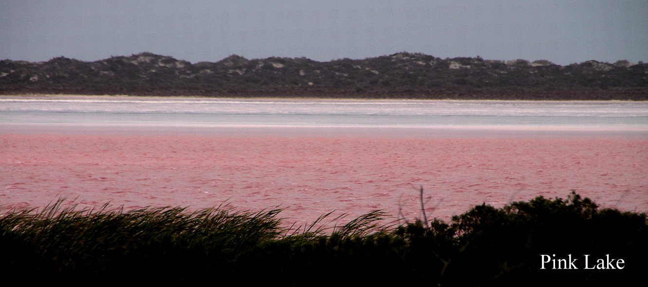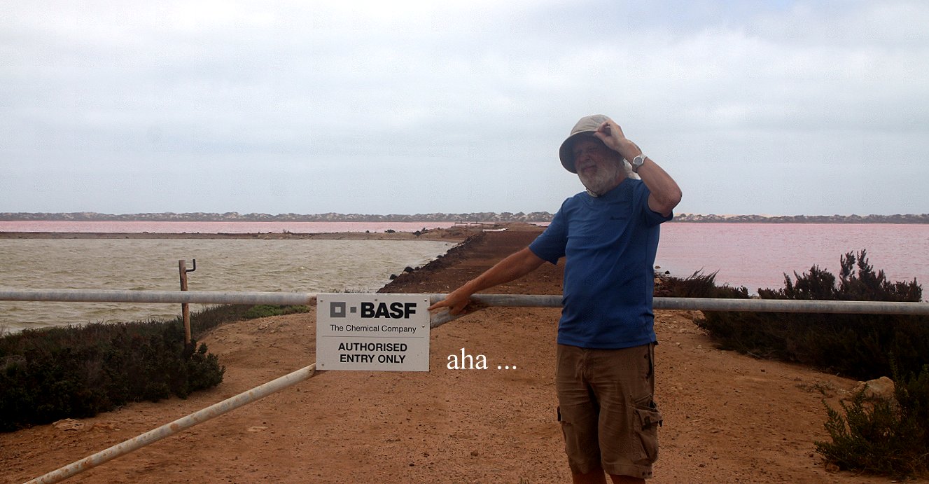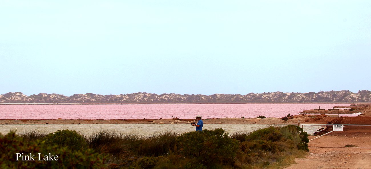 bis wieder eintönige abgeerntete Weizenfelder das Landschaftsbild bestimmten. Um 11.30 h erreichten wir den Pink Lake, einen See dessen leuchtend rosa Wasseroberfläche einen eigenartigen Kontrast zur umliegenden Landschaft bildet. Wir lasen, dass Mikroorganismen für diese außergewöhnliche Farbe sorgen. Als wir aber an den Rand des Sees gingen, sahen wir ein Schild "BASF Property". Es roch auch merkwürdig nach Chemie. Ob die rosa Farbe des Sees nicht vielleicht doch eine andere Ursache hat, ich denke da mal an manche Gewässer z.B. in China… |