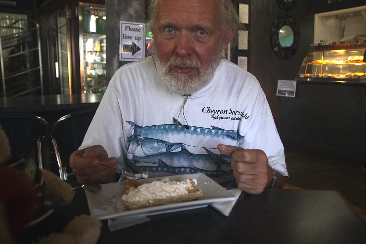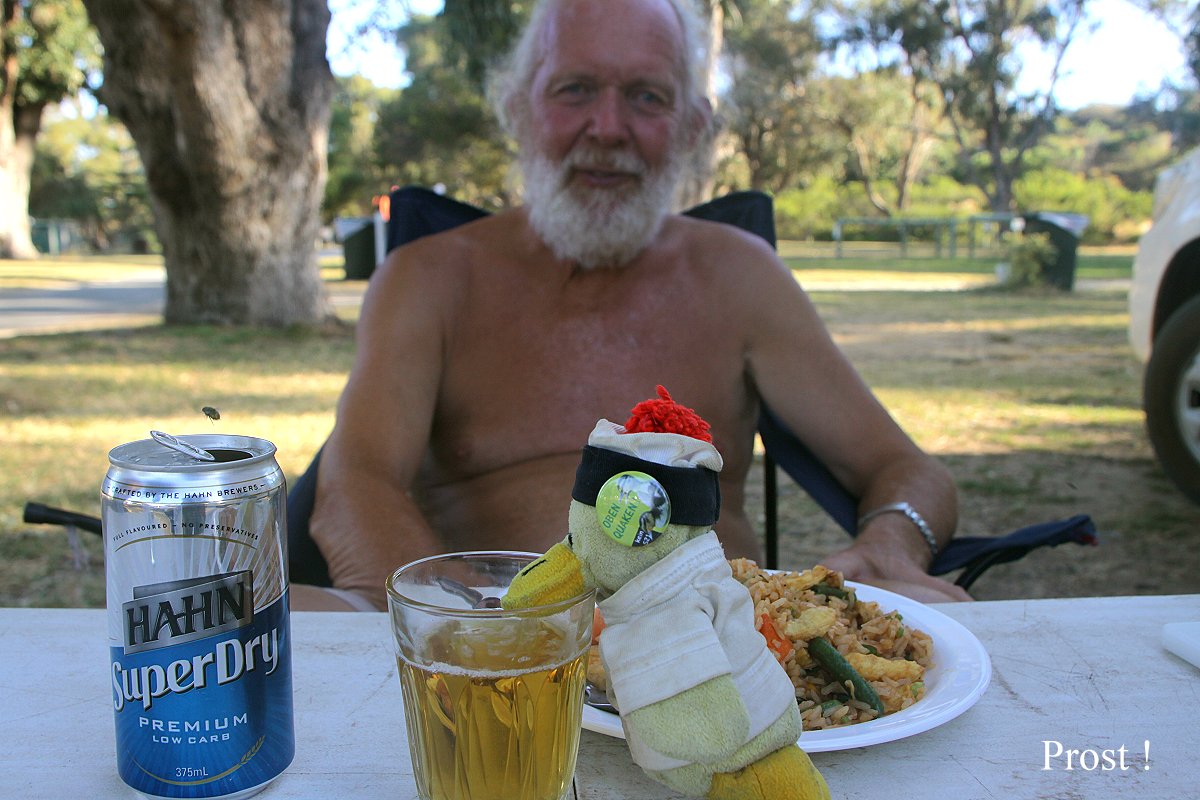 Anschließend fing ich schon mal an Tagebuch zu schreiben, während Tomoko den Rest des Abendessens vorbereitete. Zur Freude von Entelchen öffneten wir zugleich eine Dose eiskaltes Bier, sehr erfrischend… Zum Abendessen gab es Bratreis mit verschiedenem Gemüse und für mich noch Lachs dazu. Es schmeckte sehr lecker, war aber auch ziemlich scharf, so dass wir noch eine Dose Bier und den Weißwein dazu holten.
