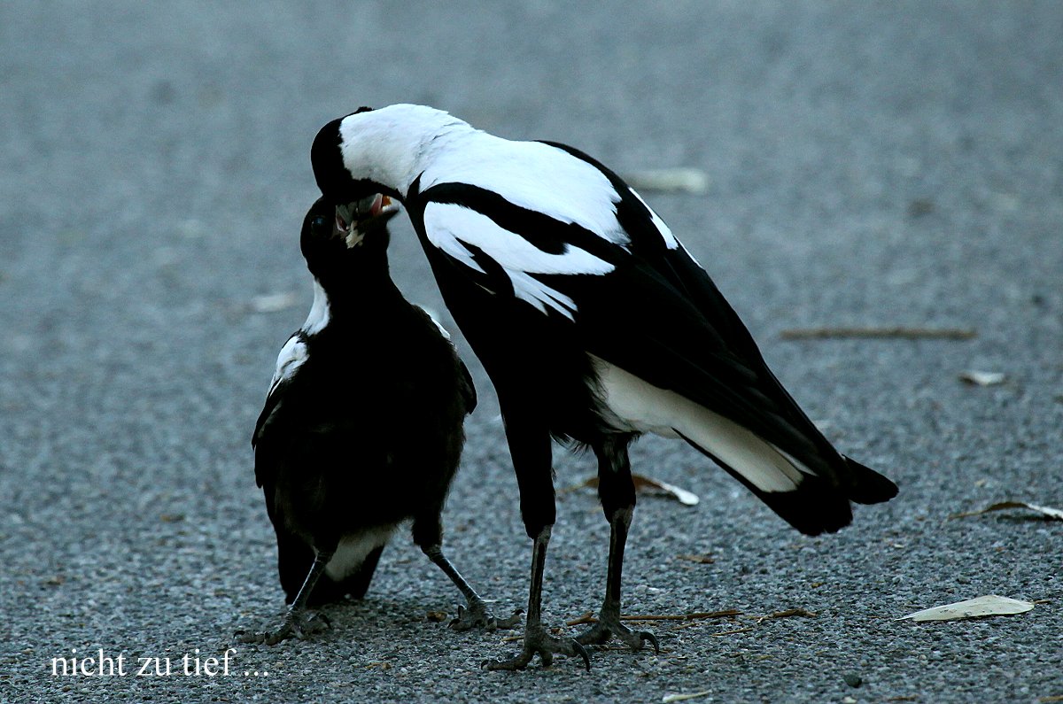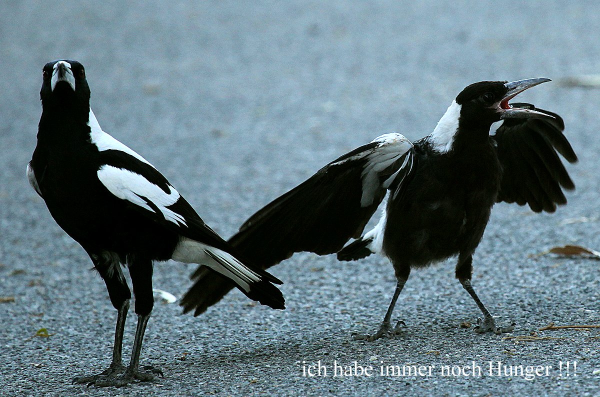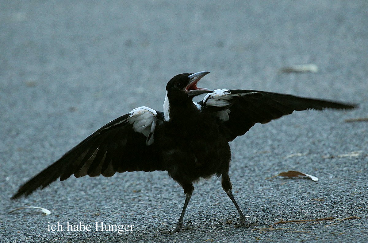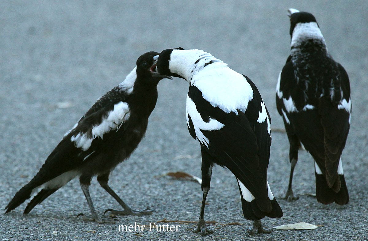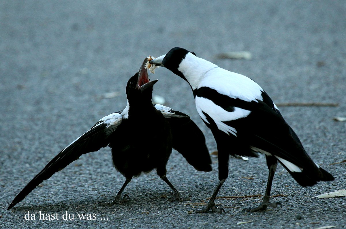 Tomoko war es zu heiß und sie zog sich zum Arbeiten ins Innere des Autos zurück, wo die Klimaanlage für angenehme Temperaturen sorgte. Ich wanderte noch ein wenig mit dem Fernglas umher, konnte aber nichts Neues entdecken, so dass ich wieder umkehrte. Tomoko machte noch einen Kaffee, bevor ich den Reis fürs Abendessen kochte. Ich gelte ja inzwischen als Spezialist für diese Tätigkeit :-). Ganz in der Nähe hüpfte eine junge Elster (Magpie) am Boden herum, die ständig nach Futter verlangte und von ihren Eltern immer wieder gefüttert wurde...