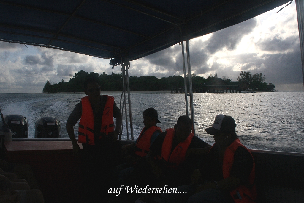 Viel Zeit blieb nicht, da um 7:00 Uhr die Abfahrt nach Sandakan erfolgte. Wir bezahlten noch unsere Wäscherechnung. Eine freundliche Angestellte hatte sie mit der Hand gewaschen. Sie stand kurz vor 6:00 Uhr vor unserer Zimmertür und sprach etwas von Laundry, was ich aber nicht verstand. Ich sagte, dass wir später an der Rezeption bezahlen werden. Etwas unschlüssig ging sie wieder weg. Erst beim Auschecken verstand ich, dass Wäsche waschen ein privater Service war und direkt bezahlt werden musste, wobei es uns frei stand, wieviel wir bezahlen wollten. Telefonisch ließ ich die nette junge Dame rufen und gab ihr 20 MYR, über die sie sich sehr freute. Nun wurde es Zeit zum Bootssteg zu gehen. Unsere Koffer wurden verladen und um 7:00 Uhr ging es pünktlich los. Ein Kreis von freundlichen Hotelangestellten winkte uns zum Abschied herzlich zu, auf Wiedersehen vielleicht im nächsten Jahr? Das Boot nahm schnell Fahrt auf. Die Insel Lankayan wurde immer kleiner und verschwand schließlich ganz aus unserem Blickfeld. |