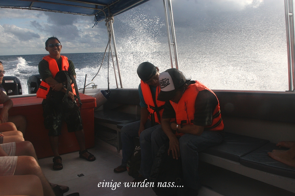 Die Wellen waren ziemlich hoch, so dass das Boot immer wieder größere Sprünge machte, wobei das Wasser kräftig aufspritzte und die uns gegenüber sitzenden Leute teilweise durchnässte. |