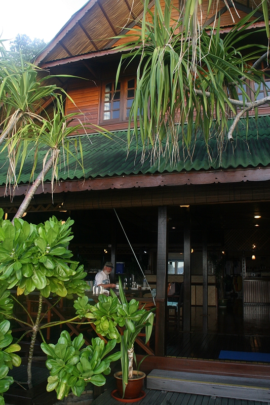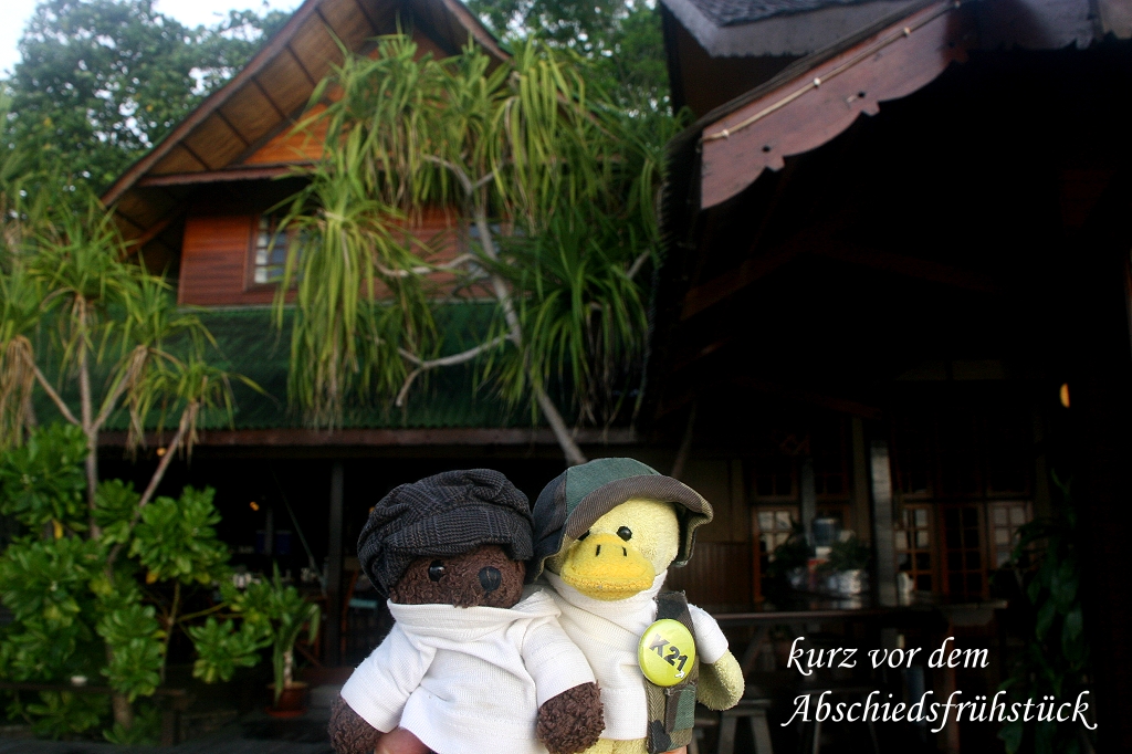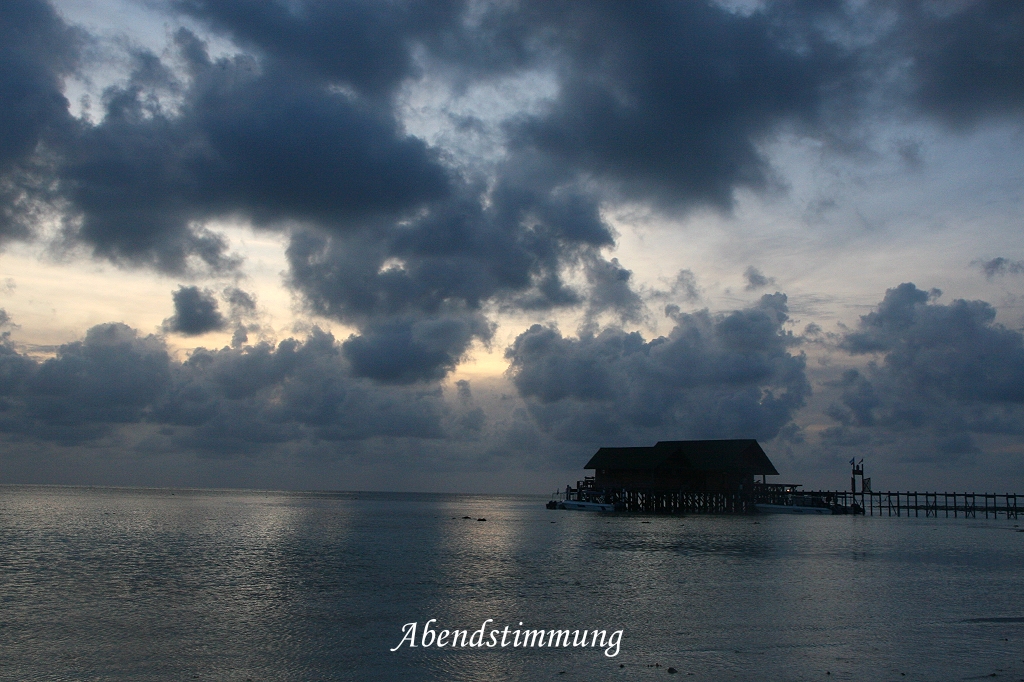 Der 15.April, mein 65. Geburtstag, war angebrochen. Es war kurz vor 6:00 Uhr, als Tomoko mir gratulierte. Es regnete immer noch leicht und der Himmel war ziemlich grau, nur eine kleine Wolkenlücke ließ die aufgehende Sonne ahnen. Als Geburtstagsgeschenk erhielt ich von Tomoko ein schönes T-Shirt von Lankayan und ein Buch über das Jahr 1945, mein Geburtsjahr. Da Michael und Anna heute um 7:00 Uhr abreisen, gingen wir früh zum Frühstück, um uns noch zu verabschieden. Der Abschied war kurz aber herzlich, vielleicht sieht man sich mal wieder, sei es in Australien, in Deutschland oder sonstwo in der Welt. Wir frühstückten in Ruhe zu Ende und schalteten anschließend unsere mitgebrachten Netbooks ein, doch leider war die Internetverbindung unterbrochen, wahrscheinlich wegen des schlechten Wetters. Es dauerte auch nicht allzu lange, als es immer dunkler wurde, und plötzlich fing es heftig an zu regnen. Die Angestellten schlossen schnell die Bambus-Rollos an der zum Meer offenen Terrassenseite. Wir blieben sitzen, schrieben Postkarten und Tagebuch und warteten einfach mal ab. Der Regen dauerte nicht allzu lange, auch das Internet funktionierte wieder. Nachdem ich meine E-mails abgerufen und gelesen hatte, gingen wir zum Bootssteg und schnorchelten etwas. Mit unserer einfachen kleinen Unterwasserkamera versuchten wir ein wenig von der prachtvollen Unterwasserwelt einzufangen. |