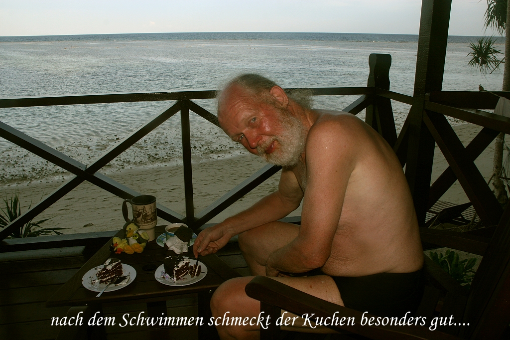 Inzwischen war Ebbe und der Wasserstand über den Korallen war so niedrig, dass ich fast mit meinem Bauch daran hängen blieb. Daher bewegten wir uns äußerst vorsichtig, denn diese Korallen sind messerscharf. Auch hier konnten wir zahlreiche meistens kleine Fische beobachten. Tomoko kannte fast alle Namen. Nachdem wir das Korallenriff vor unserem Chalet genügend inspiziert hatten, gingen wir auf unsere Terrasse und ich schnitt die Geburtstagstorte an. |