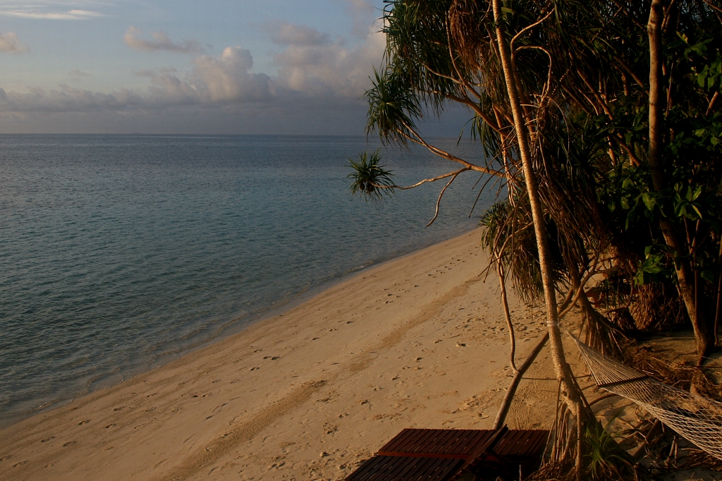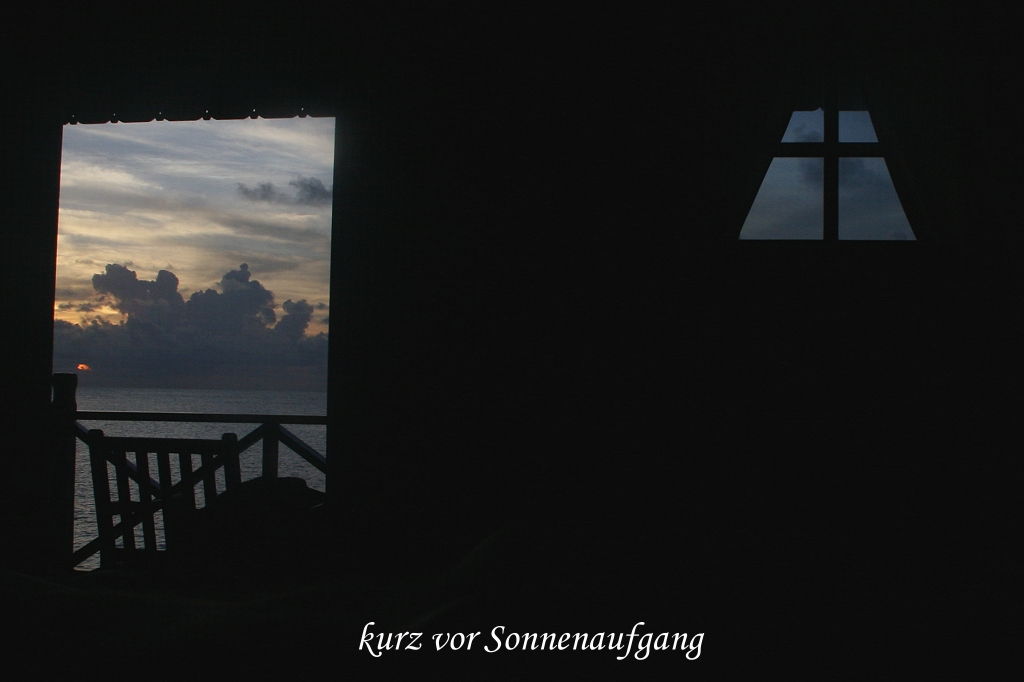 Ich setzte mich auf die Terrasse und schaute in den beginnenden Tag. Der ferne Horizont war von Wolken verdeckt, so dass wir nicht sehen konnten, wie die Sonne aus dem Meer auftauchte. Als sie dann gegen 7:00 Uhr oberhalb der Wolkenschicht zu sehen war, strahlte sie auch schon gleich heiß. Das Licht in dieser frühen Morgenstunde ist unglaublich schön. Nachdem Tomoko ihre Moskitostiche behandelt hatte, kam sie auch auf die Terrasse. |