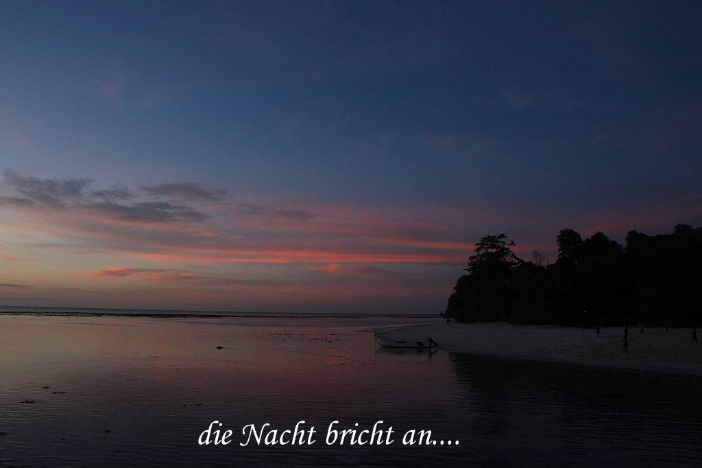 Langsam gingen wir zurück. Trotz des kalorienreichen Kuchens heute Nachmittag verspürten wir doch leichten Hunger. Also gingen wir ins Restaurant und aßen noch etwas zu Abend. Das Schwimmen im Meer und die tropische Luft verbunden mit 3 Tiger-Bier zeigten Wirkung, so dass wir gegen 21:00 Uhr schlafen gingen. Insgesamt ein unglaublich schöner Geburtstag! |