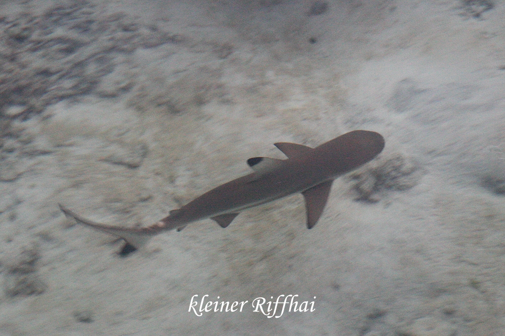Langsam aber stetig versank sie im Meer bis nichts mehr von ihr zu sehen war. Vom Bootssteg konnten wir beobachten wie ein kleiner Hai zwischen den Korallen offenbar nach Beute jagte. Rastlos schwamm er im seichten Wasser hin und her, doch wir konnten nicht erkennen, ob er mit seiner Jagd erfolgreich war. |