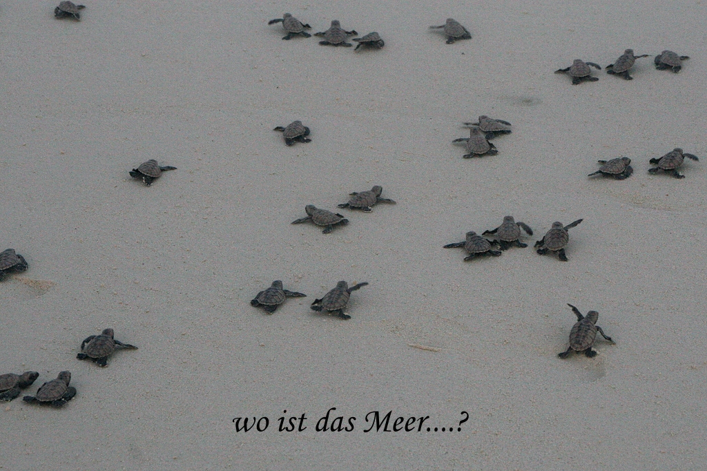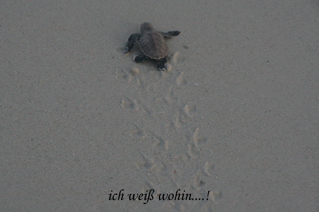 Bald schon verschwanden sie im Meer, hin und wieder sah man noch ein kleines Köpfchen aus dem Wasser auftauchen, dann waren sie verschwunden, hineintauchend in eine ungewisse Zukunft. Feinde gibt es ja genug: Möwen, Reiher, Krabben, Haie usw….. Langsam spazierten wir am Strand zu unserem Chalet zurück. Es war jetzt Ebbe und das Ufer war übersät mit Seesternen und Seegurken. |
