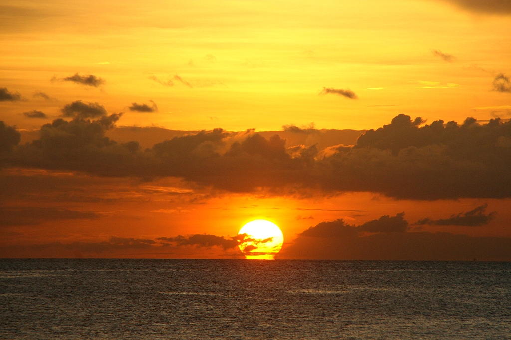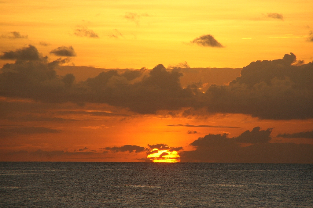 Tatsächlich erlebten wir, wie die Sonne langsam sank. Der glühende Ball wurde immer dunkler und berührte schließlich das Meer am Horizont. |
