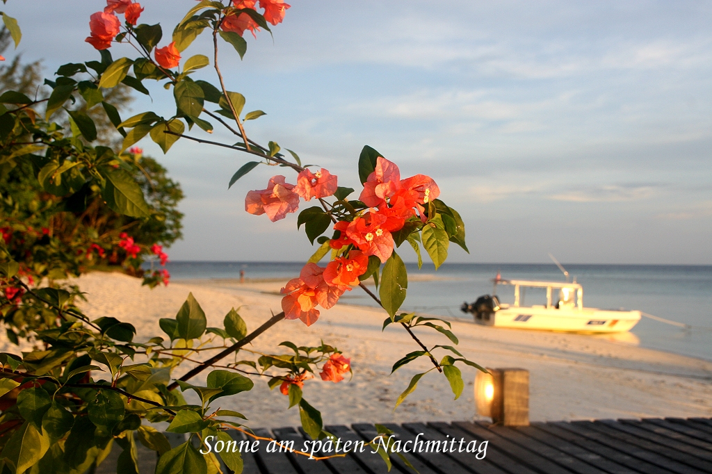 Da das Wetter heute bei kräftig strahlender Sonne besonders schön war, machte ich noch ein paar Fotos von unserem Traumstrand mit dem kräftig leuchtenden Wasser im Hintergrund. Man hat wirklich den Eindruck als sei man alleine auf dieser Insel. Da die meisten Touristen zum Tauchen hierher kommen und die Tauchreviere außerhalb des Riffs mit Booten angefahren werden, sieht man als Nichttaucher manchmal keine Menschenseele auf der Insel. Wir schnorchelten bis 17:00 Uhr am Bootssteg. Ich hatte einige Kekse in einer kleinen Plastiktüte mit ins Wasser genommen. Als ich diese im Wasser schwimmen ließ, stürzten sich Fische von allen Seiten auf das Futter. Sie fraßen mir fast aus der Hand, sehr beeindruckend. Wegen der starken Sonnenstrahlung zogen wir zum Schnorcheln immer ein T-Shirt an. Heute ist ja leider unser letzter Tag auf dieser Trauminsel und wir genossen nochmal jeden Augenblick. |