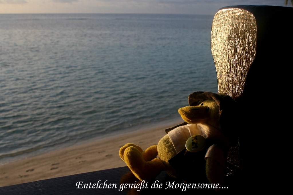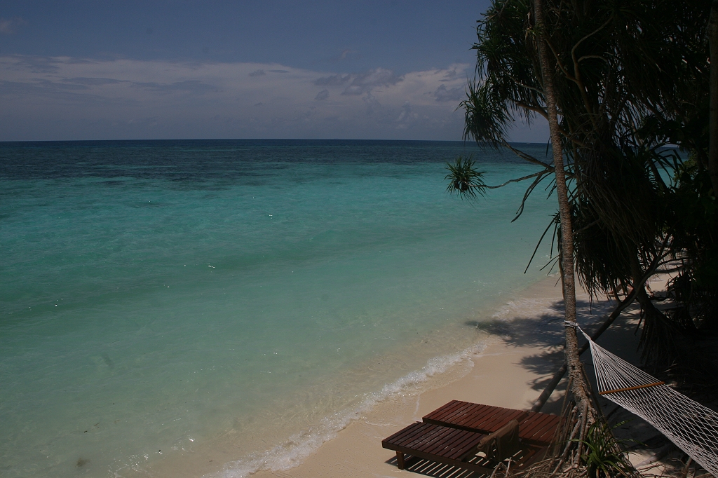 Hier blieben wir eine Weile, ehe wir zum Frühstück gingen, das wiederum lecker war. Anscheinend hatte der Koch gewechselt. Wir blieben einige Zeit im offenen Restaurant sitzen und schauten etwas Internet. Auf Tomokos Wunsch hatten wir uns für 9:30 Uhr zu einer Schnorchel-Tour mit einem Boot außerhalb des Riffs angemeldet. Zur Sicherheit lieh ich mir zusätzlich eine Schwimmweste aus, worauf ich einige missbilligende Blicke der Angestellten erntete (bin halt kein Meisterschwimmer). Das Boot fuhr mit uns beiden etwa 1 km von der Insel weg. Hier ließ man uns ins Meer steigen mit der Bemerkung, jetzt einfach mit der Strömung Richtung Insel schwimmen. Kaum waren wir im Wasser, als das Boot wieder umkehrte. Als wir plötzlich registrierten, dass wir mutterseelenallein im Meer schwammen, rings herum nichts als Wasser, gerieten wir etwas in Panik. Wir gestikulierten wild mit den Armen, wobei ich hoffte, dass man nicht glaubte, wir würden fröhlich zum Abschied winken. Gottseidank kam das Boot zurück und blieb auf unsere Bitte hin in unserer Nähe. Der Meeresboden lag etwa 10-15 m unter uns. Wir konnten einige Fische sehen, unter anderem einen kleinen Hai. Ist da vielleicht noch Vater oder Mutter Hai in der Nähe? Tomoko verspürte plötzlich ein Brennen an verschiedenen Stellen auf ihrer Haut. Auch ich fühlte kleine Stiche. Da uns das Ganze unangenehm war, schwammen wir nach 10 min zum Boot zurück. Auf Tomokos Arm zeigten sich kleine Blasen, die der Bootsführer gleich mit Essig behandelte, es waren offensichtlich Spuren von winzigen Quallen. Wir beschlossen das Unternehmen abzubrechen. Zurück am Bootssteg schaute man uns etwas merkwürdig an, von nun an waren wir als "Schlappschnorchler" gebrandmarkt. Da die Fahrt nur so kurz war, brauchten wir nichts dafür zu bezahlen. Am Ufer zurück gingen wir aber gleich wieder ins Wasser, und schnorchelten dort bis 11:00 Uhr. Auch hier sahen wir wieder zahlreiche große und kleine Fische, unter anderem einen ziemlich großen Rochen und einen großen Barracuda. Ich konnte dessen spitze Zähne deutlich sehen und blieb in respektvoller Entfernung (circa 2 m). Die Zeit bis zum Mittagessen verbrachten wir im Chalet. Die Sonne brannte heute heiß vom Himmel, so dass die Farben des Wassers von türkis bis dunkelblau besonders kräftig leuchteten. |