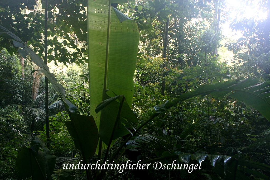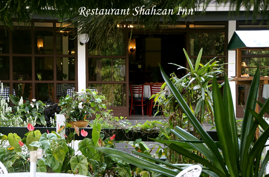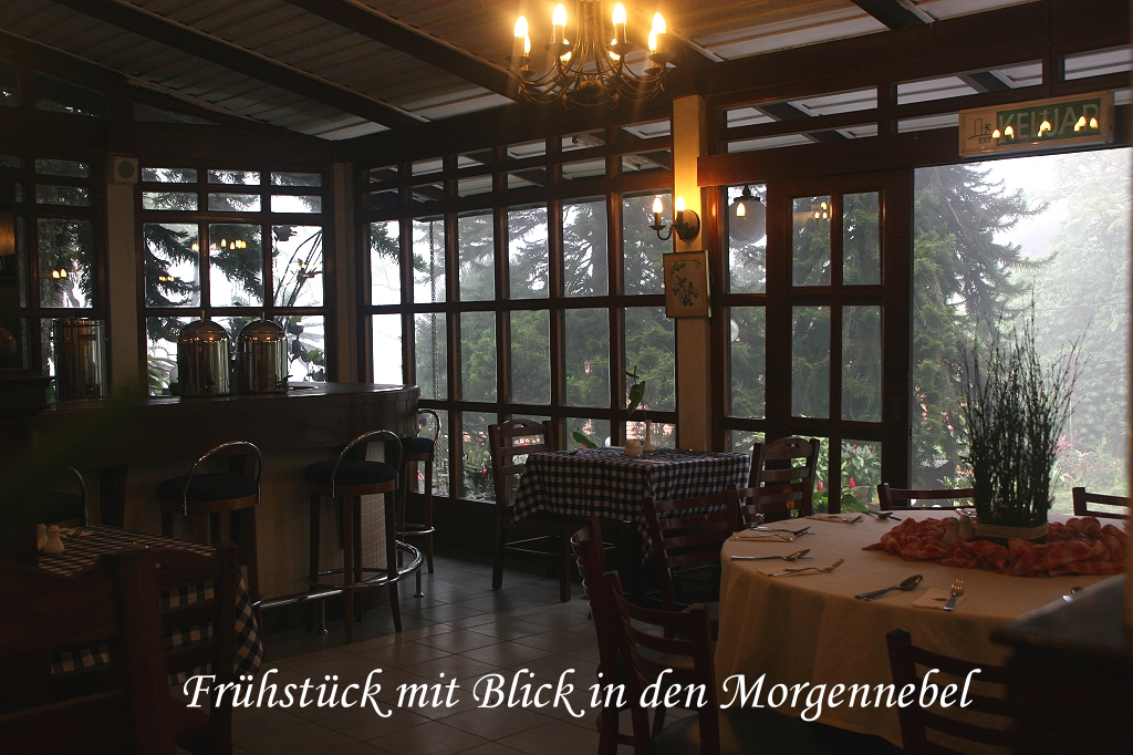 Ich konzentrierte mich zunächst auf einen Black-browed Barbet, dessen Stimme ich jeden Tag gehört hatte, ohne ihn einmal zu Gesicht zu bekommen. Tomoko entdeckte ein für uns neues Vögelchen, einen farbenprächtigen Fire-breasted Flowerpecker. Des weiteren sahen wir noch: Mountain Fulvetta, Mountain Tailorbird, Crimson Oriole, Chestnut-capped Laughingthrush, Black-eared Shrike Babbler, Streaked Spiderhunter, Fantail, Rufous-browed Flycatcher (Familie mit Kind), Golden Babbler, Lesser Raquet-tailed Drongo mit 2 schön erhaltenen Schwanzfedern, Es war wirklich unglaublich in so kurzer Zeit so viele Vögel auf einmal zu sehen. Obwohl ich langsam etwas erschöpft war, blieben wir eine gute Stunde hier. Jetzt wurde es aber Zeit für das geplante Eis, das wir uns redlich verdient hatten. Um 14:10 Uhr nahmen wir im Hotel-Restaurant Platz und bestellten für mich einen kleinen Eisbecher und für Tomoko ein Sago-Gula-Melaka (eine asiatische Süßspeise). Dazu tranken wir jeder einen Cappuccino. Der Blick von hier nach draußen in den Garten ist herrlich. Viele exotische Pflanzen mit saftigem Grün und reichen Blüten gedeihen hier in der feuchten tropischen Luft prächtig. Im Garten standen 2 gusseiserne Tische mit Stühlen. |