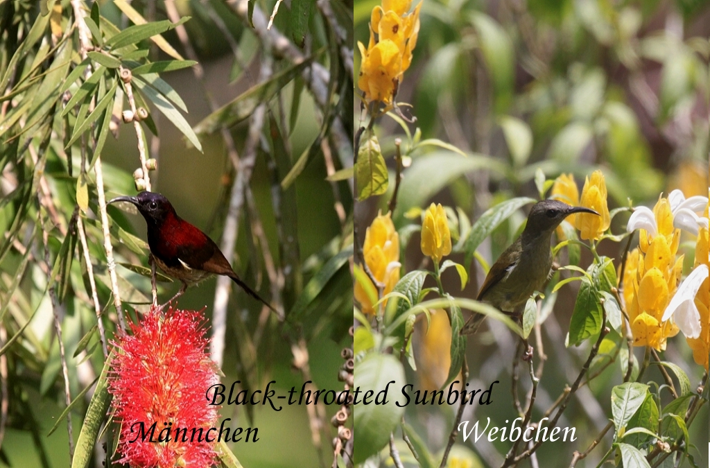 Hier setzte ich mich nach dem Eis einfach etwas unter die schattigen Nadelbäume und beobachtete das Treiben der Vögel am Futterhaus. Weil die Luft so angenehm war, holte ich mein Netbook und fing schon an mein Tagebuch zu schreiben. Tomoko war inzwischen ins Zimmer gegangen um ihre Fotos anzuschauen. Gegen 16:30 Uhr kam sie wieder zurück in den Garten. Die Sonne schien immer noch. Das tägliche Gewitter schien diesmal auszubleiben. Wir fuhren noch mal los und entdeckten in der Nähe des Bishop-Trails eine von der Nachmittagssonne warm beleuchtete Stelle mit einigen blühenden Bäumen. Hier waren etliche Black-throated Sunbirds dabei die leuchtend roten Blüten (Callistemon) nach Nektar zu durchsuchen. |