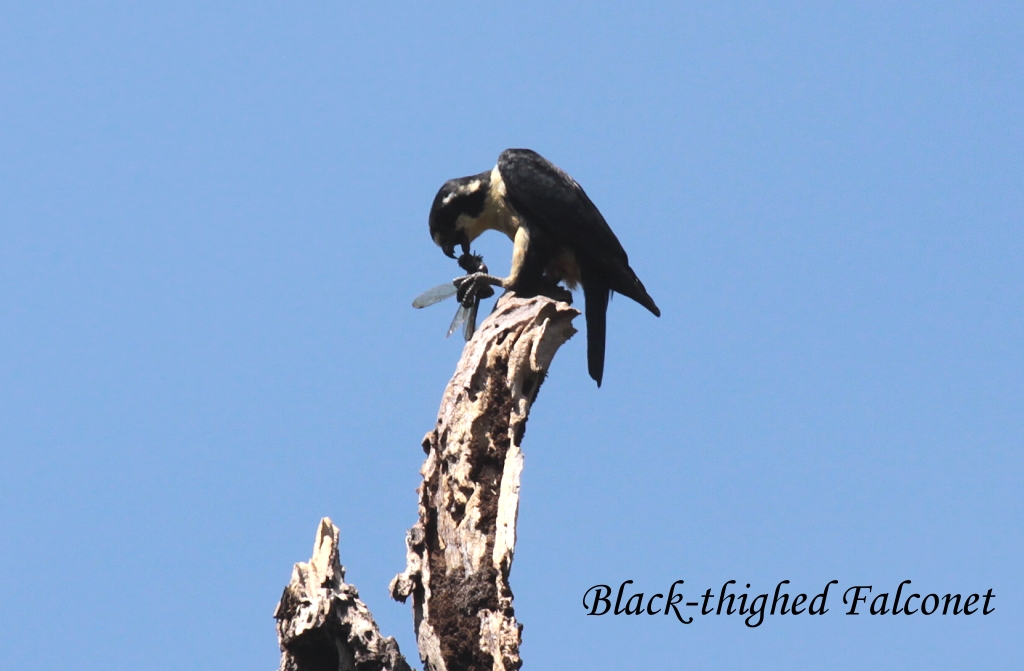Auf einer kleinen Nebenstraße (eine Abkürzung) sahen wir auf der Spitze eines trockenen Baumes einen Falken (Black-thighed Falconet) sitzen, der mit einem gefangenen Insekt kämpfte. Um 13:15 Uhr erreichten wir endlich die Stadt Jerantut. Unser Freund Keith hatte uns eine genaue Beschreibung hinterlassen von einem Baum, auf dem man voriges Jahr zwei Eulen beobachten konnte. Wir fanden den Baum in der Nähe des Bahnhofs sofort, aber von den Eulen war nichts zu sehen. Stattdessen konnten wir beobachten, wie sich zwei Pied Hornbills auf dem Dach eines nahen Gebäudes niederließen. Ein Chinese Pond Heron und ein Little Egret waren auch zu sehen. Wir fuhren langsam wieder Richtung Hauptstraße zurück. An einem schmutzigen Kanal herrschte reges Treiben. |