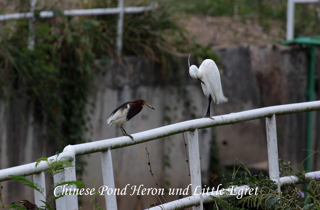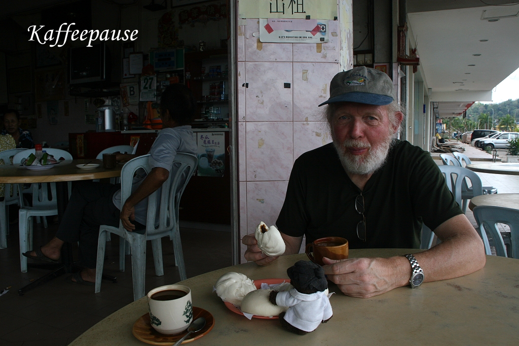 Viele Reiher (Chinese Pond Herons, Little Egrets), ein Common Tailorbird, mehrere Tauben und ein Brown Shrike bevölkerten das Ufer. An der Hauptstraße in einem kleinen chinesischen Restaurant aßen wir einige Paus und tranken einen Kaffee dazu. |