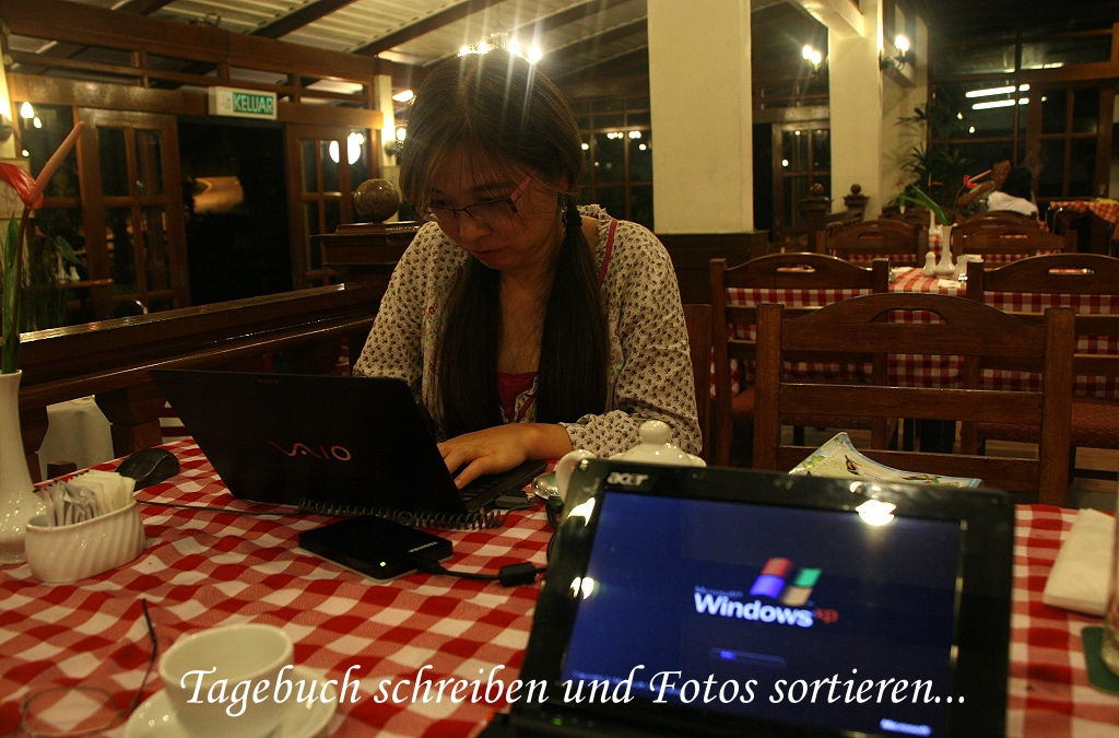 Wir fuhren an die besagte Stelle, aber leider ließ der Forktail sich nicht mehr blicken. Wir gingen nochmals ein Stück die Straße hinab. An einer Stelle warteten wir lange, weil wir einen fremden Laut aus einem hohen Baum hörten, den wir nicht kannten. Wir versuchten mit unseren Ferngläsern zu ergründen, was diesen Laut hervorbrachte, konnten aber nichts erkennen. Ein englischer Vogelbeobachter, der zufällig uns entgegen kam, meinte, dass es sich eventuell um einen Baumfrosch handeln könnte. Wir sahen noch einige Minivets, Mountain Fulvetta, Niltava und Silver-eared Mesia. Um kurz nach 18:00 Uhr waren wir wieder beim Auto und fuhren ins Hotel zurück. Da wir hungrig waren, verloren wir nicht mehr viel Zeit, sondern gingen um 18:15 Uhr zum Abendessen. Nachdem wir gründlich die Speisekarte studiert hatten, entschieden wir uns heute für das Büffet, das einen guten Eindruck machte. Wir wurden nicht enttäuscht, alles schmeckte gut. Trotzdem stopften wir uns nicht den Bauch voll. Da hier im Restaurant auch Internet empfangen werden konnte, hatten wir unsere Netbooks gleich mitgebracht und surften nach dem Essen noch ein wenig. Gegen 20:30 Uhr waren wir zurück im Zimmer und schrieben noch Tagebuch. Tomoko taten vom vielen Laufen die Beine weh und auch ich war froh, diese gegen 21:30 h endlich ausstrecken zu können und zu schlafen. |