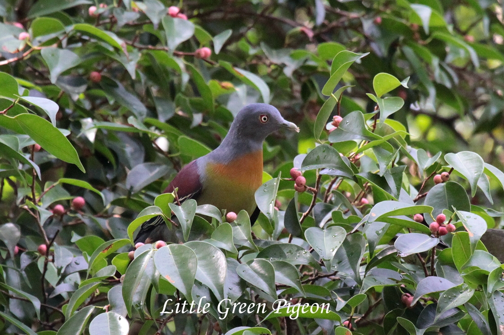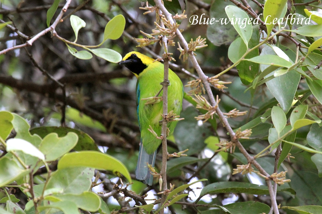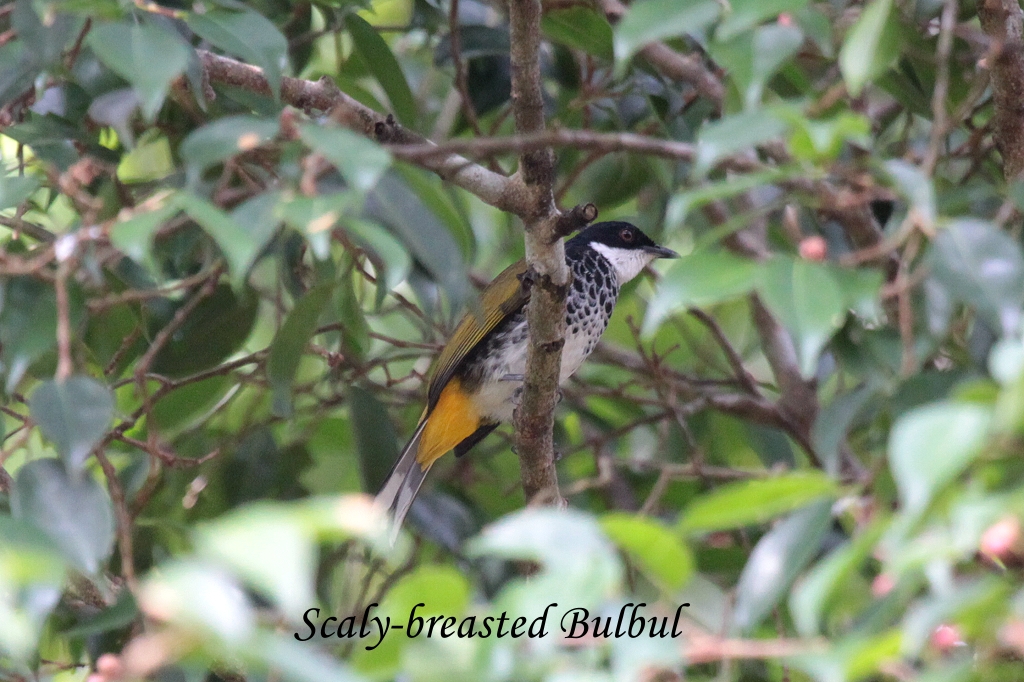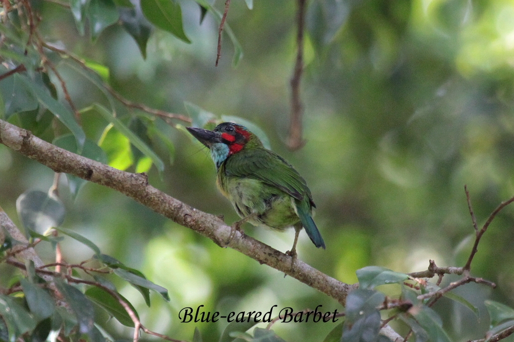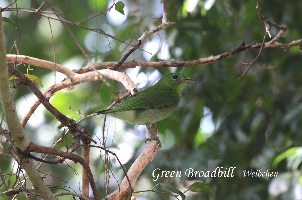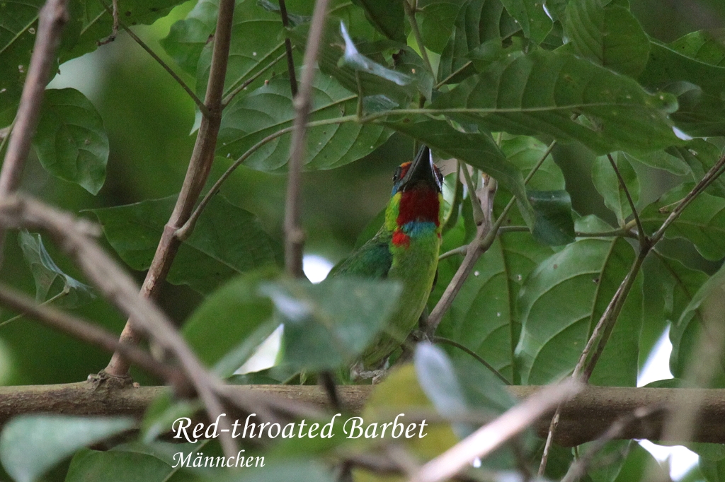 In einiger Entfernung saßen hoch auf einem Baum 5 Tauben (Thick-billed Green Pigeon). Magpie Robins mit ihrem schönen melodischen Gesang waren allgegenwärtig. Wir gingen weiter Richtung Fluss zu einem großen mit Früchten übersäten Baum, einem Fig-Tree, auf dem sich eine wahre Heerschar diverser Vögel tummelte. Innerhalb kürzester Zeit sahen wir: Blue-eared Barbet, Green Broadbill, Asian Fairy Bluebird, verschiedene Bulbuls (Red-eyed, Olive-winged, Scaly-breasted, Black-headed, Puff-backed, Yellow-vented, Streaked, Grey-cheeked ), einige Tauben (Little Green Pigeon, Thick-billed Green Pigeon), Black-naped Oriole. |