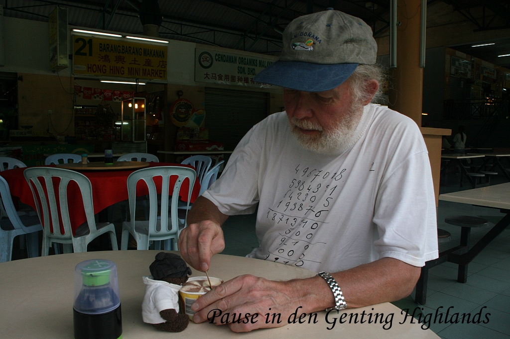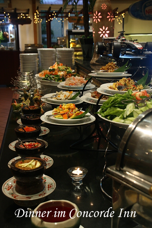Wie man uns sagte, war wegen des Formel-1 Rennens am kommenden Sonntag hier im ganz nahen Sepang das Büffet heute besonders reichhaltig, aber mit 50 MYR (11,- €) pro Person überhaupt nicht teuer. Wir aßen unter anderem viel Salat, der uns in den letzten Tagen etwas gefehlt hatte. Auch die asiatischen Nachspeisen schmeckten köstlich, wie auch die anderen Speisen. Um 19:30 Uhr waren wir wieder zurück im Zimmer, schrieben Tagebuch und surften im Internet, das hier kostenlos war. So verbrachten wir den restlichen Abend gemütlich im Zimmer und gingen gegen 21:30 Uhr schlafen. |