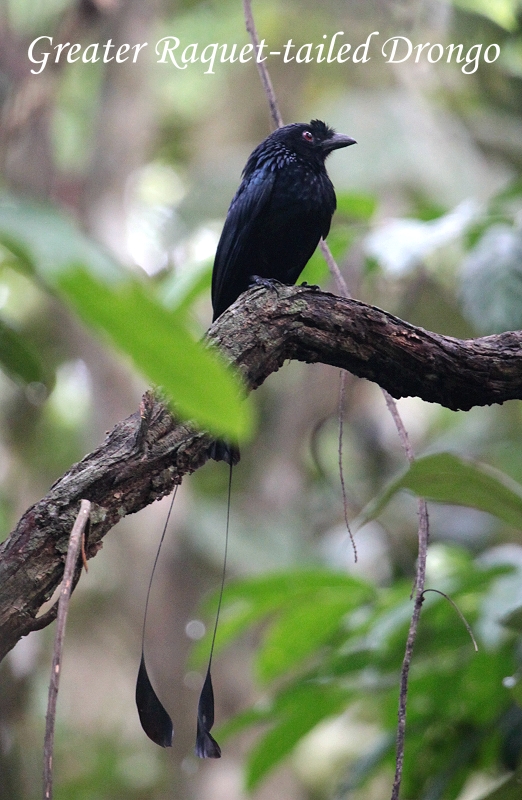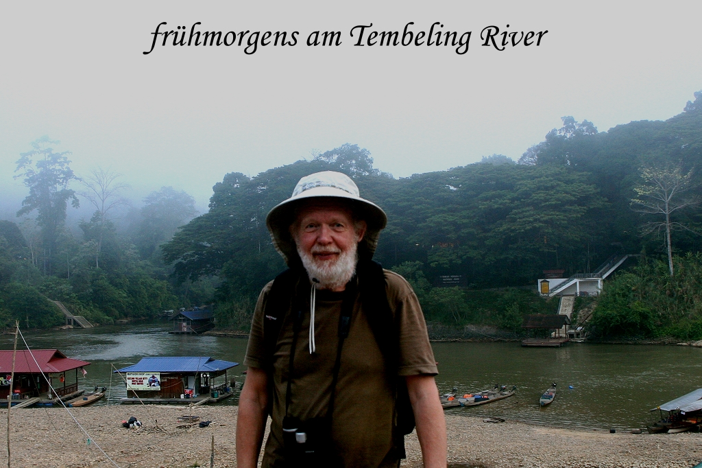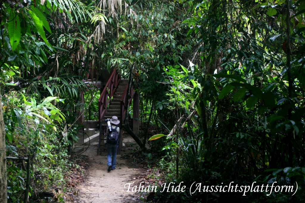 Wir waren uns nicht sicher, ob ihm etwas fehlte. Jedenfalls als wir später wieder an dieser Stelle vorbeikamen, war er nicht mehr zu sehen. Im dichten dunklen Unterholz entdeckte Tomoko einen Black-capped Babbler, der fröhlich ein Liedchen sang. Aus verschiedenen Richtungen hörten wir Spechte eifrig trommeln. Einen konnten wir identifizieren, es war ein Buff-necked Woodpecker. Ein etwas schwächeres Klopfen auf einem Baumstamm entpuppte sich als ein Greater Raquet-tailed Drongo, der in Spechtmanier mit seinem Schnabel die Baumrinde bearbeitete. Gegen 9:00 Uhr erreichten wir den Lubuk Simpon, wo wir auf einer Bank am Flussufer unser Frühstück einnahmen. Dabei flogen ein Little Heron, zwei Magpie Robin und ein Stork-billed Kingfisher vorbei. Die Sonne hatte es inzwischen geschafft den dichten Nebel zu durchdringen und es wurde wieder wärmer. Nachdem wir uns 25 min ausgeruht hatten, gingen wir den Weg langsam wieder zurück. Um 10:00 Uhr kamen wir wieder bei der Mutiara-Lodge an und gingen gleich weiter auf den Canopy-Trail. Wir gingen zügig bis zu der Stelle, wo wir gestern die Crested Partridges und Hooded Pitta gesehen hatten, doch außer einem kleinen sich bewegenden Schatten konnten wir leider nichts erkennen. Da die Zeit etwas drängte, um 12:00 Uhr mussten wir ja das Hotel verlassen, gingen wir gleich weiter bis zu dem Obstbaum, wo wir gestern die zahlreichen Vögel beobachten konnten. |