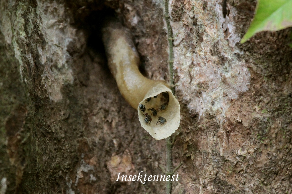Als wir da so ruhig standen, tauchten plötzlich zwei Great Argus (ein Paar) aus dem Unterholz auf und schritten langsam auf die andere Seite. Wir waren glücklich, am letzten Tag doch noch Fotos von ihnen machen zu können. Langsam gingen wir weiter. Als wir das alte Pumpenhäuschen erreichten, hörte ich ganz nah ein Summen, das offensichtlich aus einem nahen Baumstamm kam. Als ich den Stamm etwas näher untersuchte, sah ich eine Öffnung im Holz, in der ein röhrchenähnliches Gebilde steckte, aus dem kleine Insekten herausflogen. Das Summen kam aus dem Stamm, in dem sich sicher sehr viele der Insekten aufhielten. Da wir nicht wussten, ob diese fliegenähnlichen Tiere aggressiv reagieren würden, gingen wir weiter. Als wir die kleine Brücke auf dem Trail passierten, sahen wir am Abhang einen männlichen Crested Fireback stehen, der sich nicht von der Stelle rührte. |
