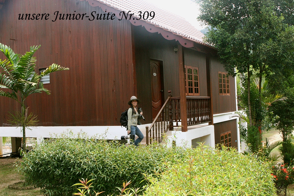 Wir nahmen Platz auf einer Holzveranda in unmittelbarer Nähe und aßen unser mitgebrachtes Nasi Lemak, das wirklich köstlich schmeckte, während wir weiter die Vögel beobachteten. Nach ungefähr einer halben Stunde verließen wir die Stelle wieder und gingen noch mal auf den Trail von vorhin in Richtung Informations-Center. Dabei konnte Tomoko endlich auch einen Hooded Pitta am Boden entdecken. Als ich hinzu kam, war er leider schon verschwunden. Intensiv suchten wir das Unterholz mit unseren Ferngläsern ab, aber wir entdeckten außer einem Paar Black-capped Babbler nichts mehr. Um 11:30 Uhr kamen wir wieder beim Info-Center an und machten hier im Schatten nochmals eine kleine Pause. Es war inzwischen wahnsinnig heiß geworden, rund 34 Grad und wir schwitzten heftig. Wir kamen mit einem anderen 68-jährigen Birder aus Großbritannien ins Gespräch, der in Kuala Lumpur lebt und öfter hierher kommt. Wir plauderten ein wenig über Gott und die Welt. Er kam gerade zurück vom Lubuk Simpon. Da es dort wohl ziemlich ruhig war im Hinblick auf Vogelaktivität, beschlossen wir, auch hinsichtlich der heute besonders großen Hitze, auf eine Wanderung dorthin zu verzichten und stattdessen zum Hotel zurückzukehren. Um 12:15 Uhr waren wir auf der anderen Flussseite angekommen. Wir ergänzten unsere Wasservorräte in einem kleinen Laden und fuhren mit dem Auto, das in der prallen Sonne glühend heiß geworden war, zurück ins Hotel. Wir wollten im Souvenir-Shop ein Eis kaufen, doch leider "tutup" (geschlossen). Schnell fuhren wir nochmals den kurzen Weg zum Fluss zurück und kauften das Eis in dem dortigen kleinen Laden. Nun aber zurück. Als wir unser Zimmer öffneten, strömte uns die durch die Klimaanlage angenehm kühle Luft entgegen. Jetzt sofort eine erfrischende Dusche, ein kühles Bier und eine kleine Siesta. Tomoko aß ihr Eis sofort, während ich das meinige für später ins Eisfach unseres Kühlschranks legte. Später tranken wir auf unserer Terrasse einen Kaffee und ein Glas kühlen Guava-Saft. Um 17:00 Uhr war es immer noch wahnsinnig heiß draußen, so dass wir unseren geplanten Ausflug etwas in die kühleren Abendstunden verschoben. Um 18:20 Uhr verließen wir das Hotel und fuhren zum Fluss. Wir verzichteten aber auf einen Spaziergang auf der anderen Seite, sondern suchten direkt ein Restaurant. |