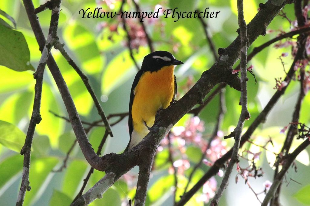 Immer wieder wechselte er die Position, flog mal hierhin mal dorthin, kletterte schnell einen Stamm hinauf, immer wieder von Blättern verdeckt. Endlich gelang es Tomoko ein gutes Foto zu schießen, während ich gleichzeitig mit dem Fernglas die Halspartie des Spechtes genauer erkennen konnte, anhand derer wir ihn endlich identifizieren konnten. Es war ein Checker-throated Woodpecker. Ein weiterer schöner Vogel mit rötlichem gefächerten Schwanz tauchte ganz kurz in den Wipfeln auf. Wir waren uns nicht ganz sicher, aber es könnte sich um einen Raffle's Malkoha gehandelt haben. Ein Stückchen weiter war ein Greater Raquet-tailed Drongo zu sehen. Da jetzt mit fortschreitender Uhrzeit der Trail immer mehr von Wanderern und laufenden Sportlern benutzt wurde, die teilweise sich ziemlich laut bewegten, verließen wir den Trail und betraten das Gelände der Mutiara-Lodge. In einem Obstbaum sahen wir einen wunderschönen Yellow-rumped Flycatcher und viele Bulbuls. |