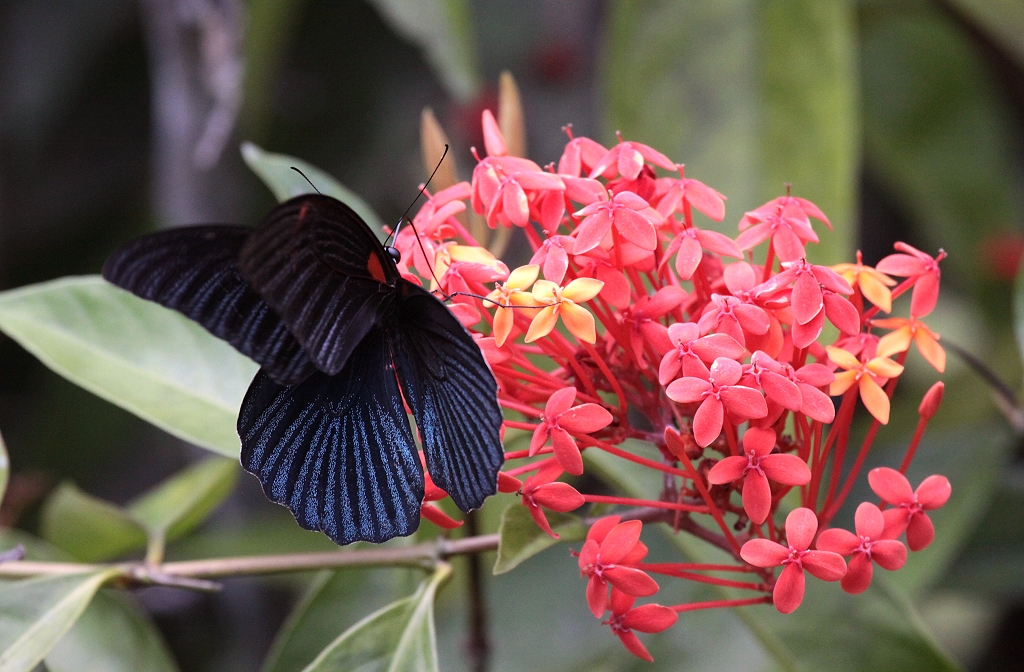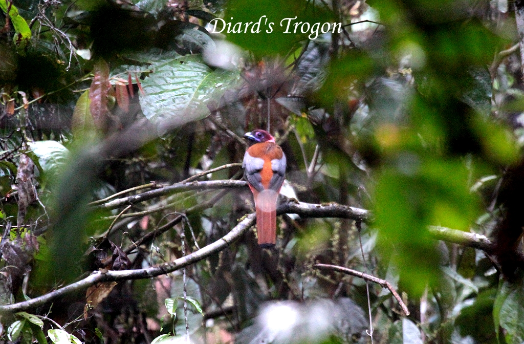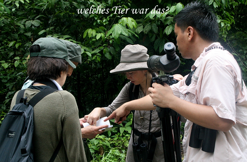 Gleich bei der zweiten Aussichtsplattform winkte Rafel mir zu schnell nachzukommen und tatsächlich, endlich konnte ich den lange gesuchten Black-and-Yellow Broadbill sehen, ein bisschen weit für ein Foto, aber ganz klar im Fernglas zu erkennen. Nicht weit davon saß im gleichen Baum ein Dark-throated Oriole. Der Broadbill schien in diesem Baum ein Nest zu haben. Ich beobachtete den Baum eine Weile und ging dann weiter. Als ich am anderen Ende des Canopy-Walks ankam, dort wo er wieder auf die Straße traf, standen Tomoko und Vater zusammen mit einer chinesischen Gruppe und schauten angespannt in die Büsche. |
