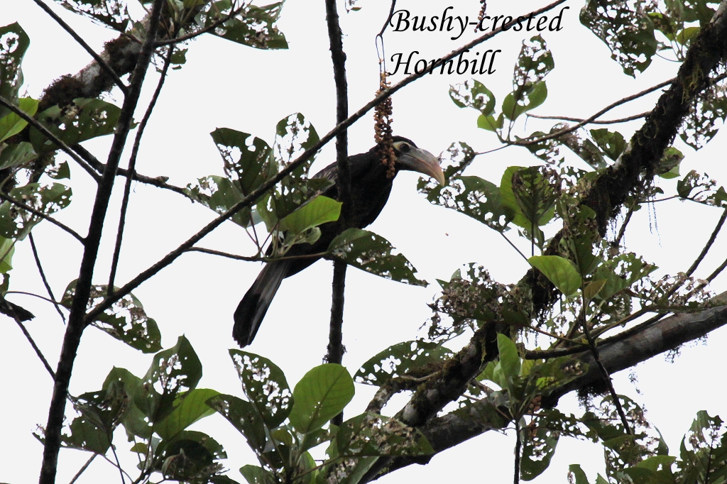 Zunächst fuhren wir die Straße nach Tawau ca. 20 km, dann bog eine Straße nach Westen ab, die sich sehr bald in eine Schotterstraße wandelte. So fuhren wir insgesamt 95 km durch den Urwald. Der Busfahrer fuhr ziemlich schnell in Anbetracht der ungeteerten Straßenoberfläche, doch insgesamt sehr sicher. Unterwegs flogen uns plötzlich zwei Rhinoceros Hornbill entgegen, die auf einem nahen Baum sitzen blieben. |