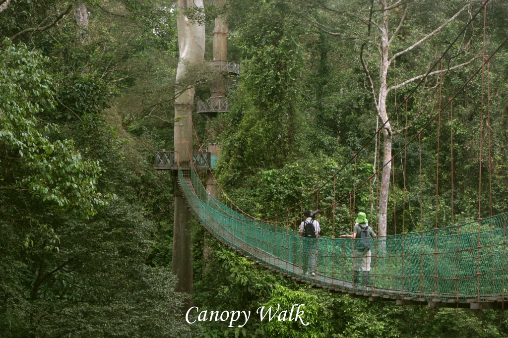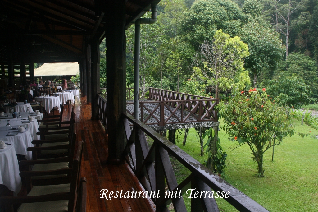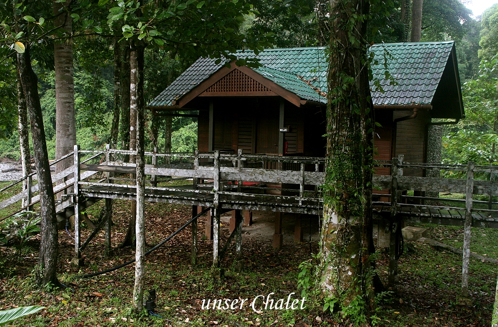 Die Begrüßung war äußerst freundlich, jeder ankommende Gast wurde mit einem aus grünen Pflanzen gemachten Halsband begrüßt. Ein freundliches Mädchen erklärte uns einiges über die Lodge. Da erst eines unserer beiden Zimmer fertig war, gingen wir gleich zum Mittagessen, das gerade um 12:00 Uhr begann. Wir erhielten einen schönen Platz mit prächtiger Aussicht auf den Fluss. Die Mitarbeiter waren alle überaus freundlich, überhaupt war die gesamte Atmosphäre überwältigend. Das Mittagsbüffett war reichlich und schmeckte ausgezeichnet. Vater entdeckte einen Crested Serpent Eagle hoch am Himmel kreisen. Tomoko entdeckte in einem nahen Busch einen weiblichen Orange-bellied Flowerpecker. Das Wetter war heiß und sonnig. So langsam wurden wir ein wenig müde und zogen uns zu einer kleinen Siesta ins Zimmer zurück. Die Zimmer sind große Chalets, die über Holzstege miteinander verbunden sind. Als wir hineingingen, waren wir erstmal sprachlos, eine solch schöne geschmackvolle Einrichtung mitten im Dschungel ist unglaublich. Das Badezimmer ist riesig und wenn man es durch eine Glastür verlässt, steht man auf einem Balkon, in den eine private Jacuzzi-Badewanne im Freien eingebaut ist, wirklich großartig. Vom Balkon entdeckte Tomoko einen farbenprächtigen Crimson Sunbird in einem Busch. Wir ruhten uns etwas aus. Um 15:00 Uhr machten wir Bekanntschaft mit Rafel, unserem Führer für die nächsten 3 Tage. Er war sehr nett und machte vor allen Dingen einen kompetenten Eindruck. Wir zogen unsere Wanderschuhe an und die Leech-Socken, was sich als sehr berechtigt erwies. |