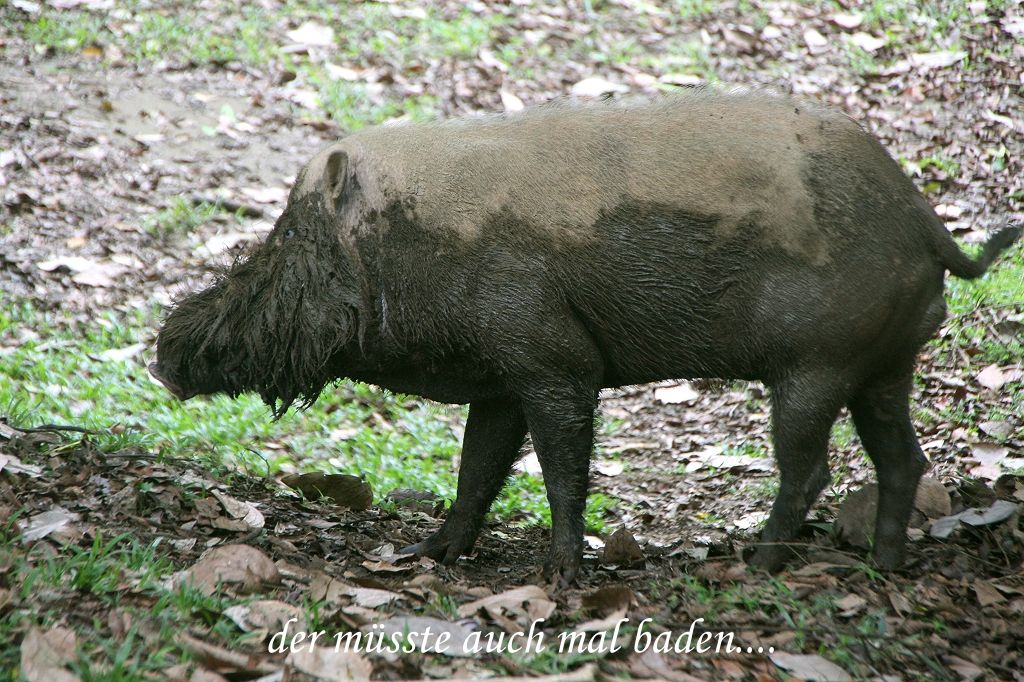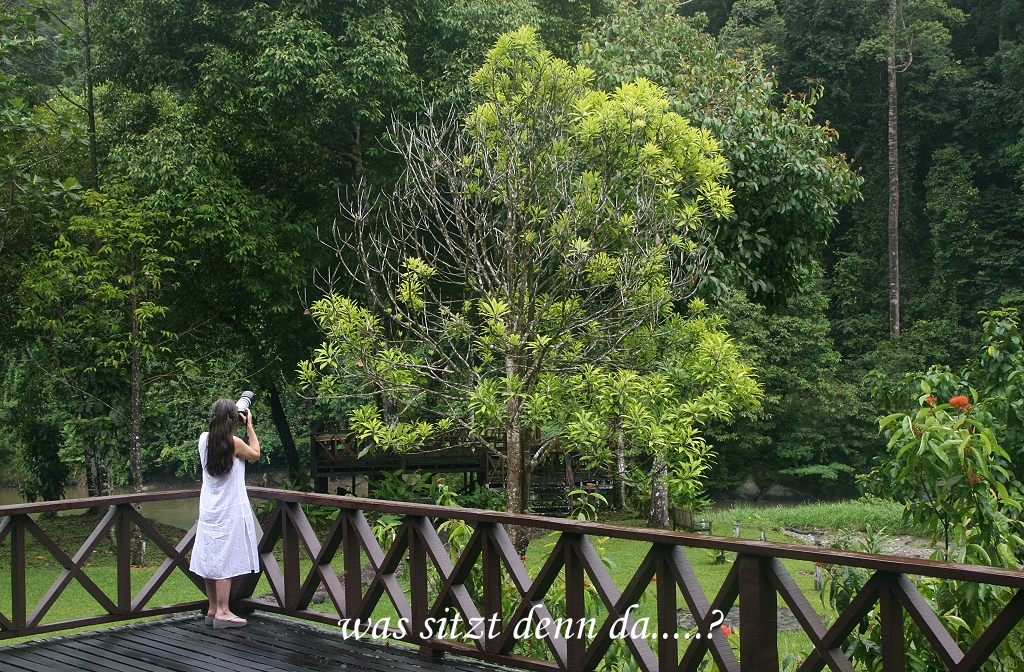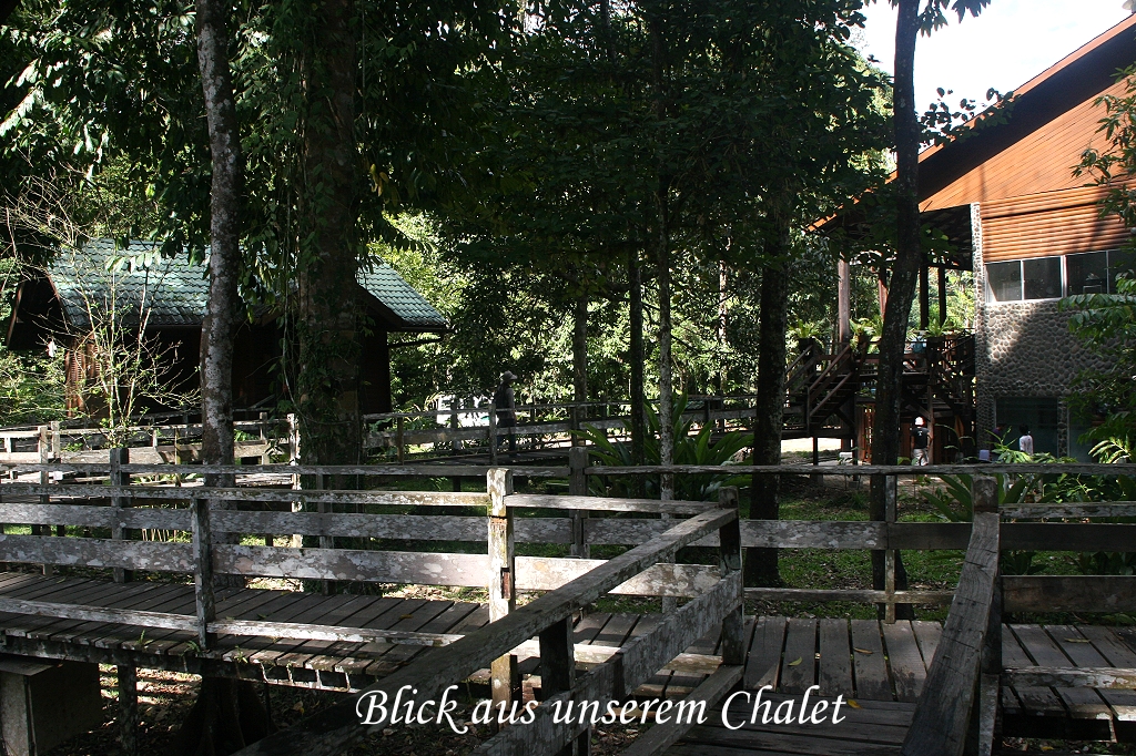 Am heutigen Ostermontag standen wir wieder um 5:30 Uhr auf und gingen um 6:00 Uhr zum Frühstück. Es dämmerte bereits und der Blick von der Terrasse in den Urwald wurde heller und klarer. Die ersten Stimmen wurden laut, von Ferne ließ ein Gibbon seinen markanten Ruf hören. Wir machten uns fertig für die Morgenwanderung. Als wir vorne an die Rezeption kamen, standen schon einige Menschen mit Fotoapparaten unter der Veranda und beobachteten einen großen männlichen Orang Utan, der gemächlich durch die Wiese vor der Veranda schritt, ein großartiger Anblick. |