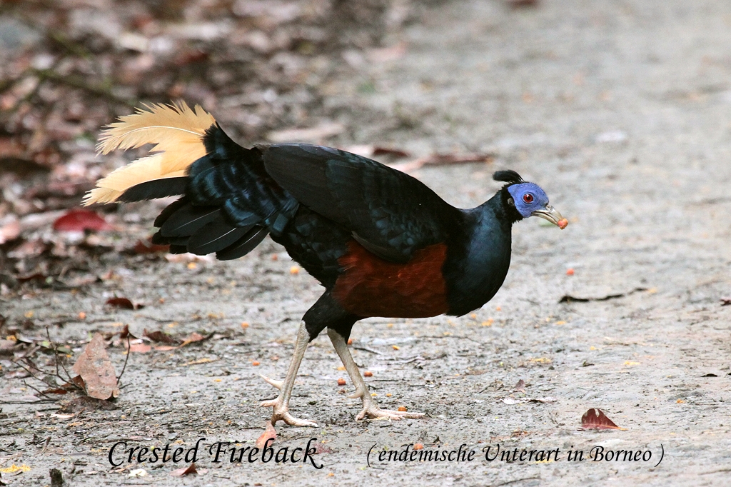 So langsam wurde es ruhiger im Wald, doch auf einmal tauchten 3 Crested Firebacks auf der Straße auf. Diese Art hat im Unterschied zu der Art auf der malayischen Halbinsel einen leicht orange gefärbten Schwanz und rostbraune Flecken an der Brust. Rafel verabschiedete sich von uns und wir gingen die letzten paar Meter alleine zur Lodge zurück. Ich wollte gerade mit Tagebuch schreiben beginnen, als Vater an die Tür klopfte und mich zu einem Glas Whisky auf sein Zimmer einlud. Dem kamen wir gerne nach. Um 19:00 Uhr dann wieder Abendessen, wie immer sehr lecker und reichhaltig, obwohl der Pudding heute Abend weniger gut schmeckte als gestern. Um 20:30 Uhr waren wir noch mal mit Rafel zu einer kleinen Nachtwanderung verabredet. Tomokos Eltern waren nicht so sehr daran interessiert und kamen nicht mit. Tomoko wollte ursprünglich wegen starker Kopfschmerzen auch nicht mit, aber da sie sich auf einmal besser fühlte, überlegte sie es sich noch mal anders. |