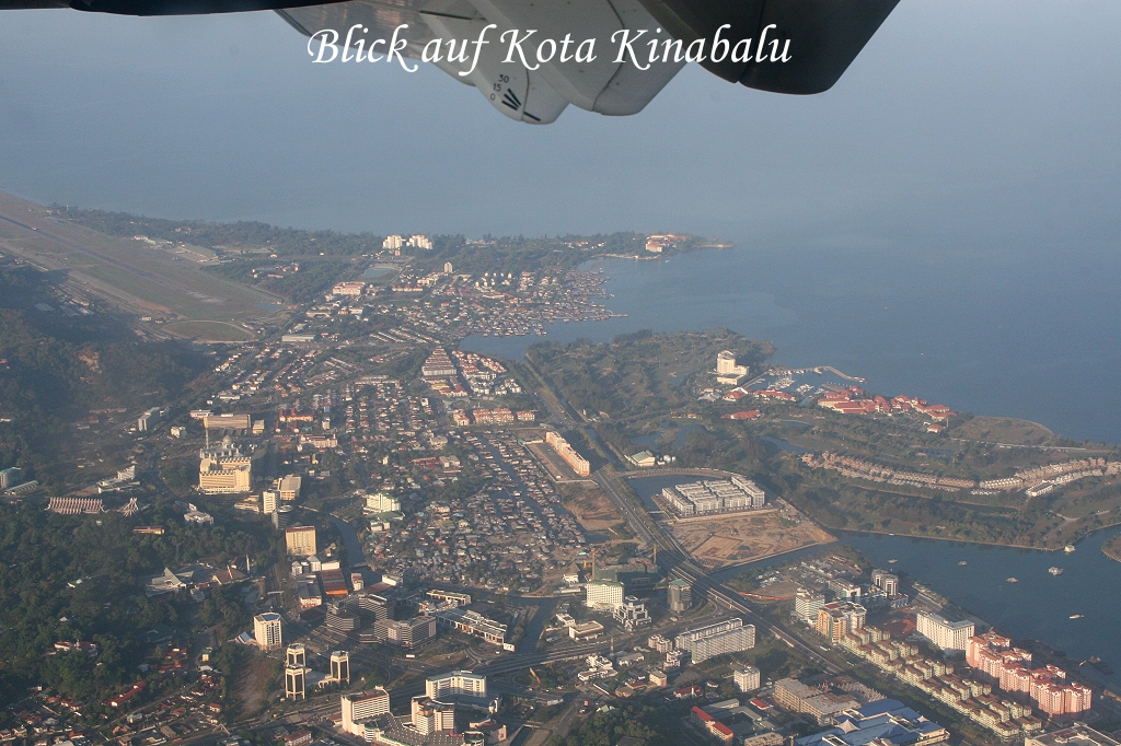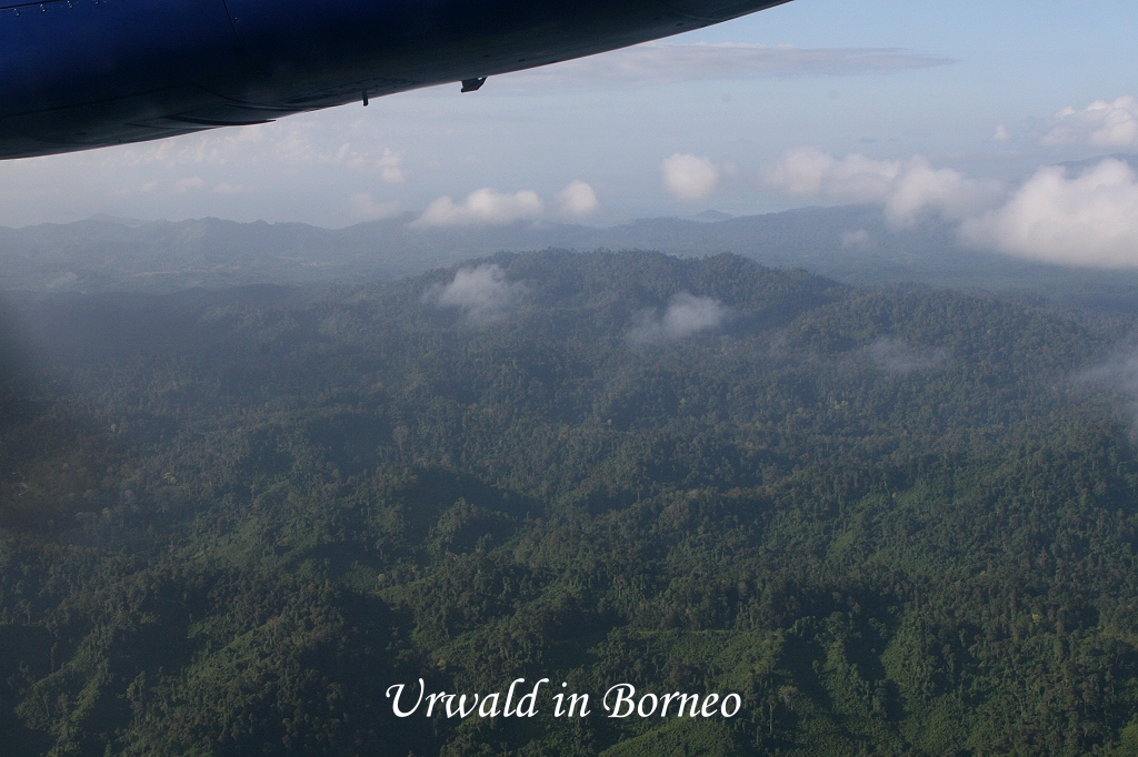 Das Flugzeug, eine Fokker 50, startete pünktlich um 7:00 Uhr. In einer weiten Schleife kreisten wir über Kota Kinabalu. Der über 4000 m hohe Mount Kinabalu war gut sichtbar, meistens ist er von einer dichten Wolkendecke verhüllt. Weiter ging es über unendliche Urwälder Richtung Lahad Datu im Osten. Nach gut 45 Minuten Flug kamen wir schon an. |
