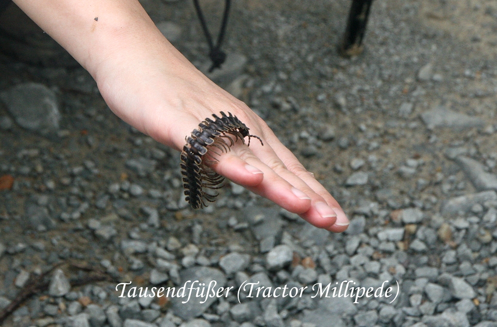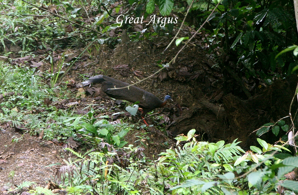 Ein kleines Stück weiter krabbelte ein Tausendfüßer (Tractor Millipede)über die Straße. Als Rafel erklärte, dass diese Art nicht giftig sei, nahm Tomoko ihn in die Hand und ich machte ein Foto. Im gleichen Augenblick überquerte gleich hinter uns ein Great Argus majestätisch die Straße. Ich schaffte es so gerade noch ein Foto zu machen, bevor er wieder im Dickicht verschwand. Gegen 11:00 Uhr kamen wir etwas müde wieder bei der Lodge an. Wir wurden vom Personal mit kühlenden feuchten Tüchern empfangen, sehr angenehm. Zurück im Zimmer wurde zuerst mal geduscht, dann relaxten wir ein wenig auf dem Bett und später noch ein wenig auf dem Balkon. |