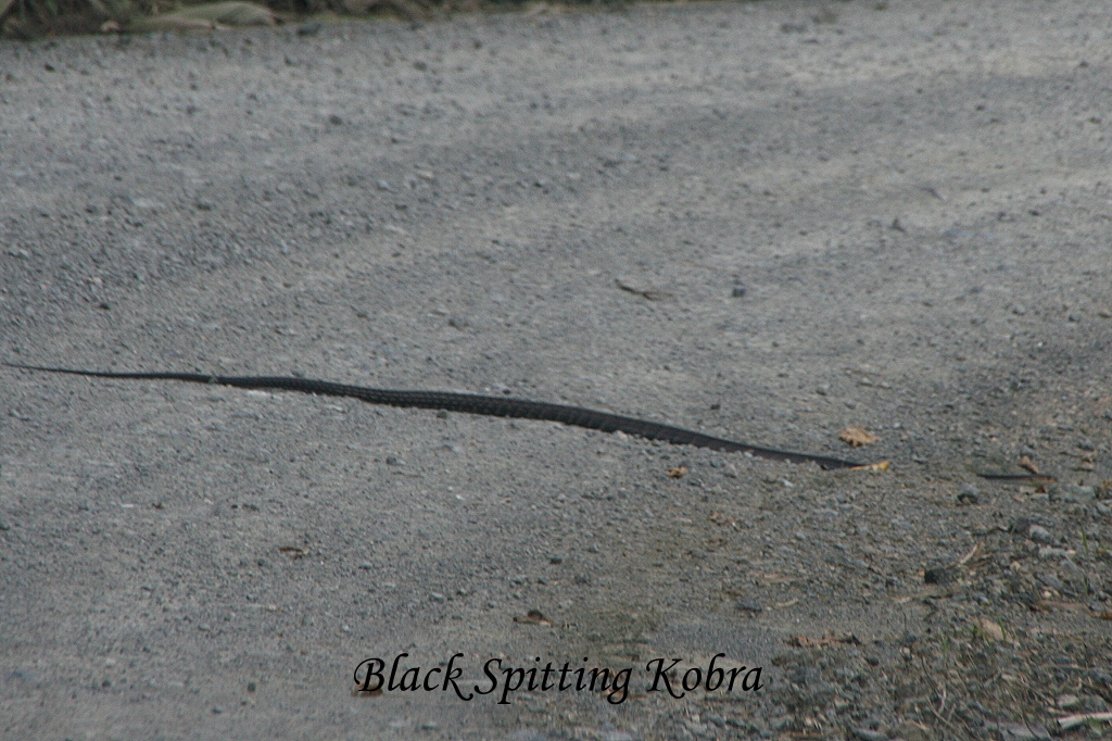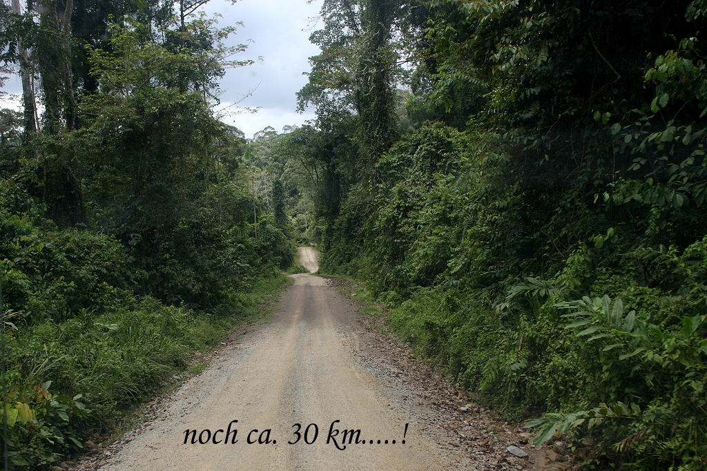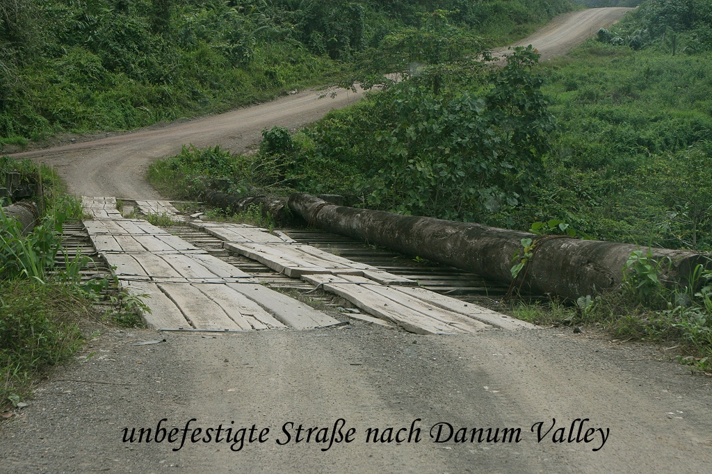 Wir hielten an, stiegen aus und beobachteten sie eine Weile, dann ging es weiter. Ich saß vorne neben dem Fahrer und sah in der Ferne etwas langes Schwarzes auf der Straße liegen, das sich langsam weiterbewegte. Als wir näherkamen konnten wir erkennen, was es war, eine mindestens 3 m lange armdicke Schlange, die innerhalb von wenigen Sekunden lautlos im Gras neben der Straße verschwand. Wie ich später in der Lodge hörte, könnte es sich um eine sehr giftige Spitting Kobra gehandelt haben. Zwischendurch sahen wir immer wieder dicke Kothaufen auf der Straße, die von den hier lebenden Pygmy-Elefanten stammten. Die meisten waren ziemlich trocken, aber an einer Stelle sahen sie noch ziemlich frisch aus, was etwas Hoffnung erweckte, vielleicht einige Elefanten zu Gesicht zu bekommen, doch daraus wurde leider nichts. Nach 2 ½ Stunden kamen wir endlich ziemlich durchgeschüttelt bei der Borneo Rainforest Lodge an. |