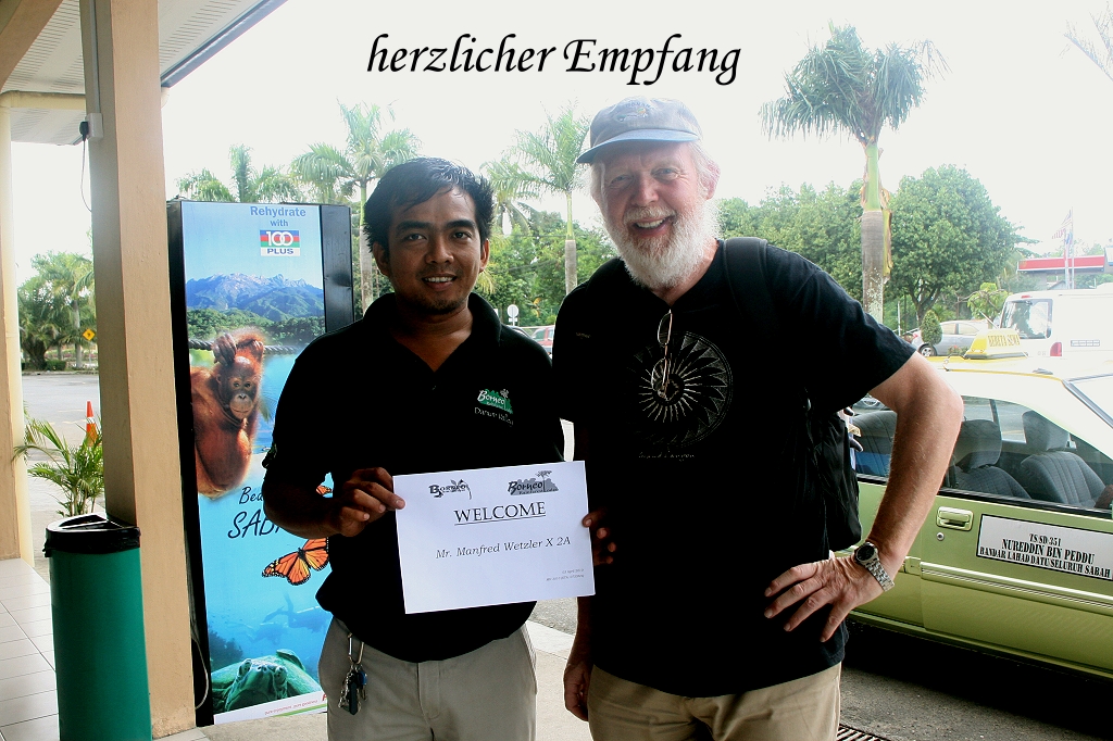 Am kleinen Flughafen wurden wir herzlich von Mitarbeitern der Borneo Rainforest Lodge mit einem Namensschild "Manfred Wetzler" in Empfang genommen. Mit einem Minibus ging es zunächst ins Büro inmitten der Stadt. Hier mussten wir einige Formalitäten erledigen (Anmeldung, Restzahlung) und uns bis 9:15 Uhr gedulden, da die offizielle Abfahrtszeit zur Lodge erst um diese Zeit stattfand. Es stiegen noch zwei junge Leute aus Schweden zu, dann ging es endlich los. |