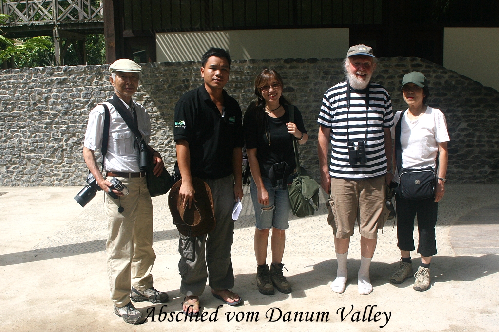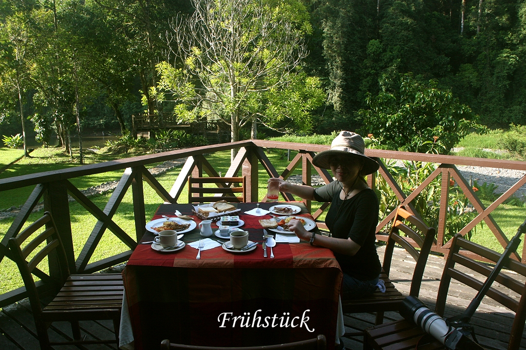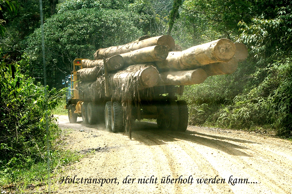 Die Sonne brannte schon heiß vom Himmel, so dass wir unseren Tisch ein wenig in den Schatten rückten. Dann ging es ans Koffer packen, denn es hieß Abschied nehmen von Danum Valley. Um 10:00 Uhr stand ein Minibus bereit. Wir bedankten uns nochmals für alles, besonders bei Rafel unserem so kompetenten wie liebenswerten Führer. Für seinen beruflichen Werdegang stellte ich ihm ein besonders gutes Zeugnis aus, er hatte seine Aufgabe wirklich gut gemacht. Wir haben uns vorgenommen, bald wieder hierher zu kommen. Als wir endlich losfuhren, stand das ganze Personal (zumindest ein Teil) bereit und winkte uns zum Abschied zu. Wir mussten wieder die 92 km lange Strecke bis Lahad Datu fahren, die ersten 77 km auf unbefestigter Straße. Es herrschte sehr wenig Verkehr, hin und wieder tauchten schwer mit Holz beladene Lastwagen auf, deren Fahrer aber immer bereitwillig Platz zum Überholen machten. |