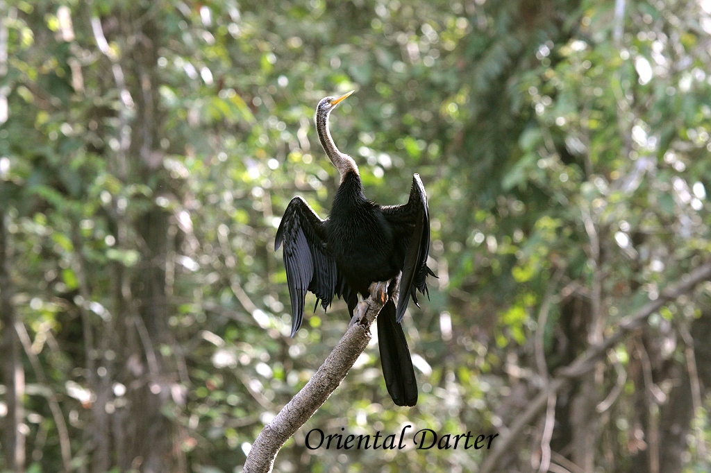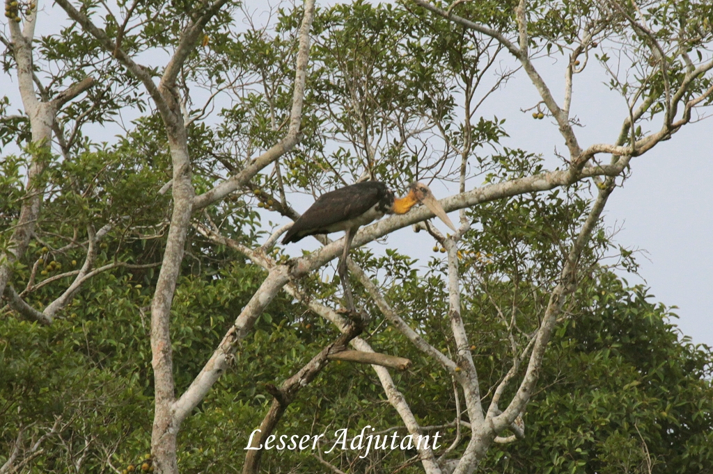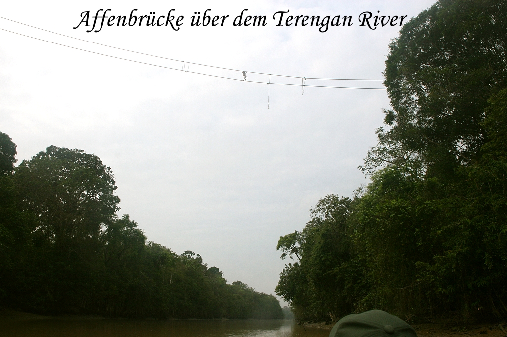 Einige Bäume weiter entdeckten wir einen weiblichen Orang Utan. Wir blieben eine Weile an dieser Stelle und beobachteten ihr geschicktes Klettern. Weiter ging es bei leichter Bewölkung aber angenehmer Temperatur. Ein weiterer White-bellied Sea Eagle zeigte sich sowie ein Crested Serpent Eagle. Auf einem Baum am Fluss zählten wir 10 Oriental Darters und etwas weiter saß ein Jerdon's Baza. Am Flussufer lag ein mächtiges Krokodil, das sich aber schnell im Wasser versteckte, als wir uns näherten. In der Nähe bewegten sich zwei Common Sandpipers. Jamil rief "ein Stormstork"! Als er wegflog, erkannten wir, dass es ein Lesser Adjutant war, ein storchenähnlicher Vogel. Nun erreichten wir die Mündung des Terengan Rivers in den Kinabatangan River. Hier ist ein doppeltes Seil über den Fluss gespannt, um den schwimmunfähigen Orang Utans die Flussüberquerung zu ermöglichen. Gerade als wir ankamen, war eine Gruppe Proboscis Monkeys dabei zum anderen Ufer zu wechseln. |