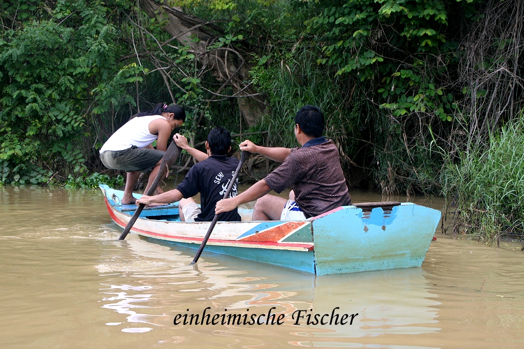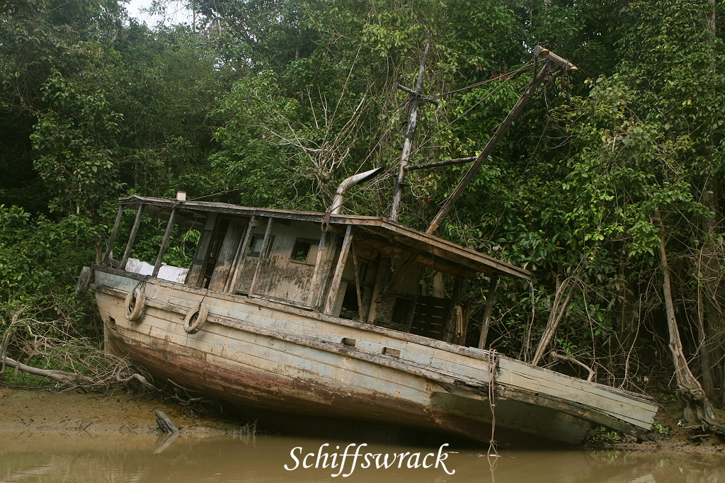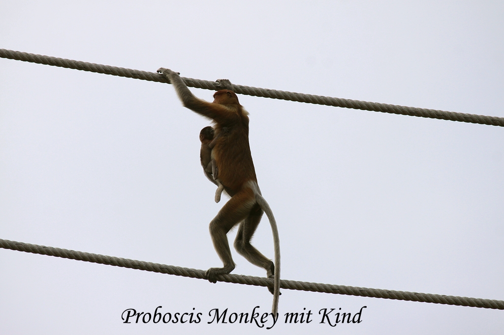 Einige kleinere Affen hatten ein wenig Mühe, das obere Seil zu fassen, doch auch sie erreichten sicher das andere Ufer. Gleich links daneben waren einige Silver Languren und Proboscis Monkeys dabei, frische junge Blätter der Mangroven zu pflücken und zu verspeisen. Wir fuhren ein Stückchen weiter an einem im letzten Jahr gestrandeten Schiffswrack vorbei, als uns ein weiteres Boot begegnete. Als wir vorbeifuhren, entdeckte ich Robert Chong im Boot stehend, den Besitzer des Kinabatangan Jungle Camps, wo wir in 2 Tagen wohnen werden. Ich erkannte sein Gesicht sofort von einem Foto im Internet. Die Begrüßung war herzlich und er bestätigte uns nochmals, dass man uns am 10.April um 10:00 Uhr bei unserer Lodge mit einem Boot abholen werde. |
