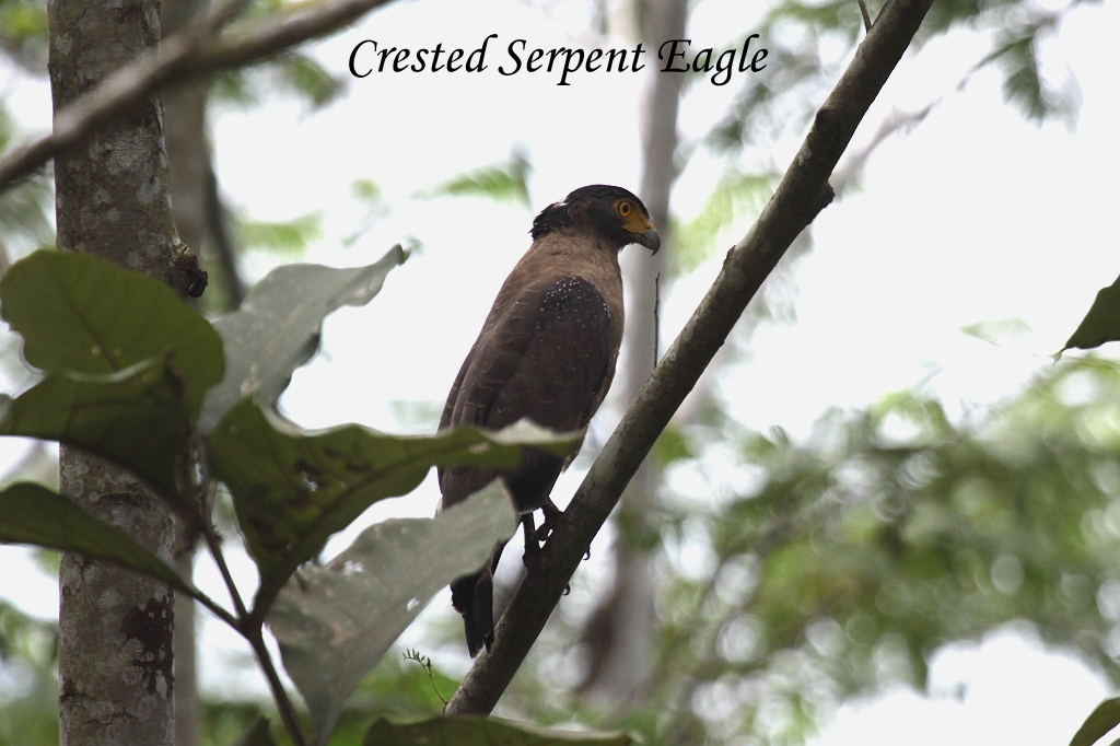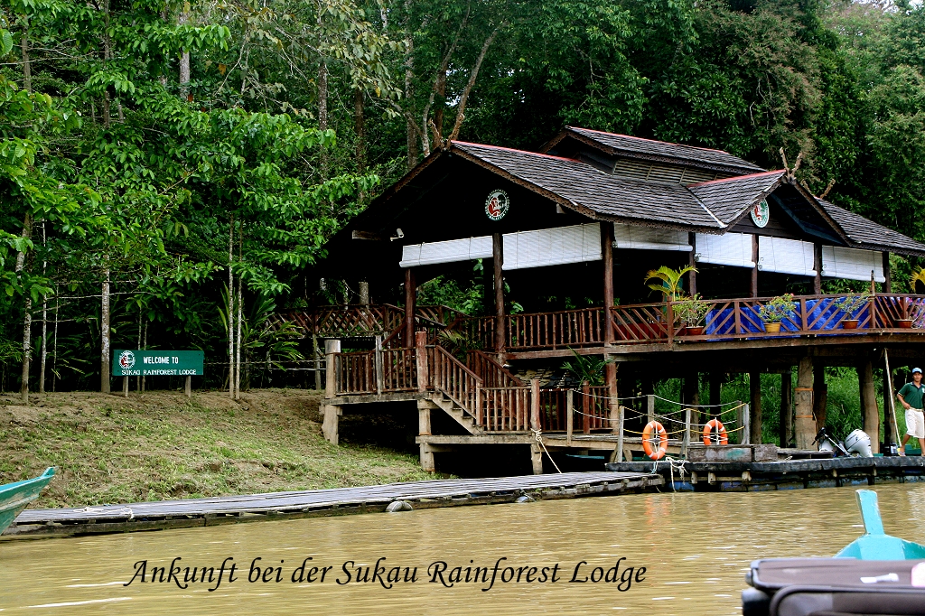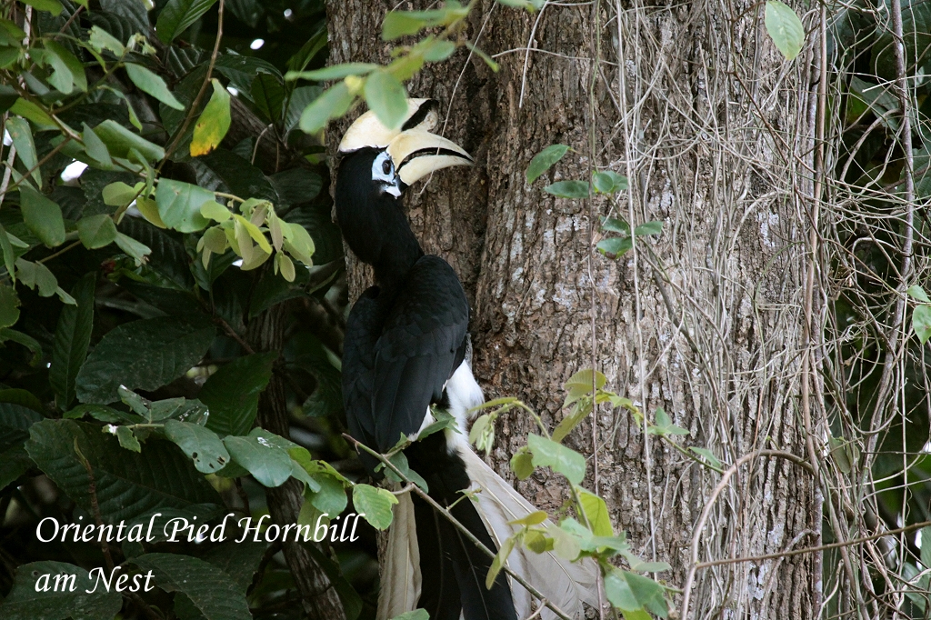 Wir warteten bestimmt 10 min, doch er kam leider nicht näher. Erstes Donnergrollen kündigte ein nahendes Gewitter an. Wir gingen zurück. Ich blieb mit meinem Netbook bei der Rezeption und schrieb schon mal Tagebuch, während der tropische Regen herunterrauschte. Um 12:15 Uhr ertönte zu aller Überraschung schon der Gong, der uns zum Mittagessen auf die Terrasse am Fluss rief. Eigentlich sollte das doch erst um 13:00 Uhr stattfinden. Macht nichts, essen wir eben jetzt. Es gab leckere Shrimps süß-sauer, gebratenes Hähnchen und gebratenes Gemüse in Oyster-Sauce mit Reis. Tomoko und ich blieben anschließend gleich hier sitzen, da ein angenehmer Wind vom Fluss herüberwehte, und beide beschäftigten wir uns mit unseren Computern. Tomoko sichtete Fotos, während ich weiter Tagebuch schrieb. Der Regen hatte zwischenzeitlich aufgehört. Plötzlich wurde ich furchtbar müde und wir gingen zurück in unser Zimmer. Trotz des durch einige amerikanische Kinder verursachten Lärms konnte ich ein wenig schlafen. Als wir aufwachten regnete es wieder. Aus diesem Grund verzichteten wir auf die geplante Bootsfahrt um 15:30 Uhr und vereinbarten im Tausch einen Besuch morgen in den Gomantong Höhlen, in denen zahlreiche Segler nisten und Tausende Fledermäuse hausen. Es regnete munter weiter. Ich nutzte die Gelegenheit um unseren Rückflug nach Singapur am 17.04. neu zu buchen, da der ursprünglich geplante Flug so verschoben worden war, dass wir ihn zeitlich nicht nutzen konnten. Tomoko schaute währenddessen mit ihrer Mutter Fotos und ihr Vater ordnete seine Aufzeichnungen, die er während unserer Ausflüge gemacht hatte. Da bis zum Abendessen noch Zeit war, unternahmen wir einen Spaziergang auf dem Hornbill-Trail. Wir machten die Runde zweimal. Beim ersten Mal sahen wir hoch in den Bäumen ein Paar Oriental Pied Hornbills.
