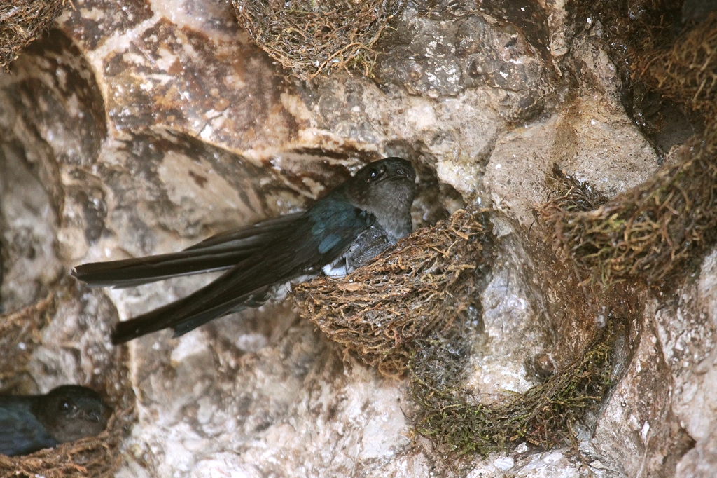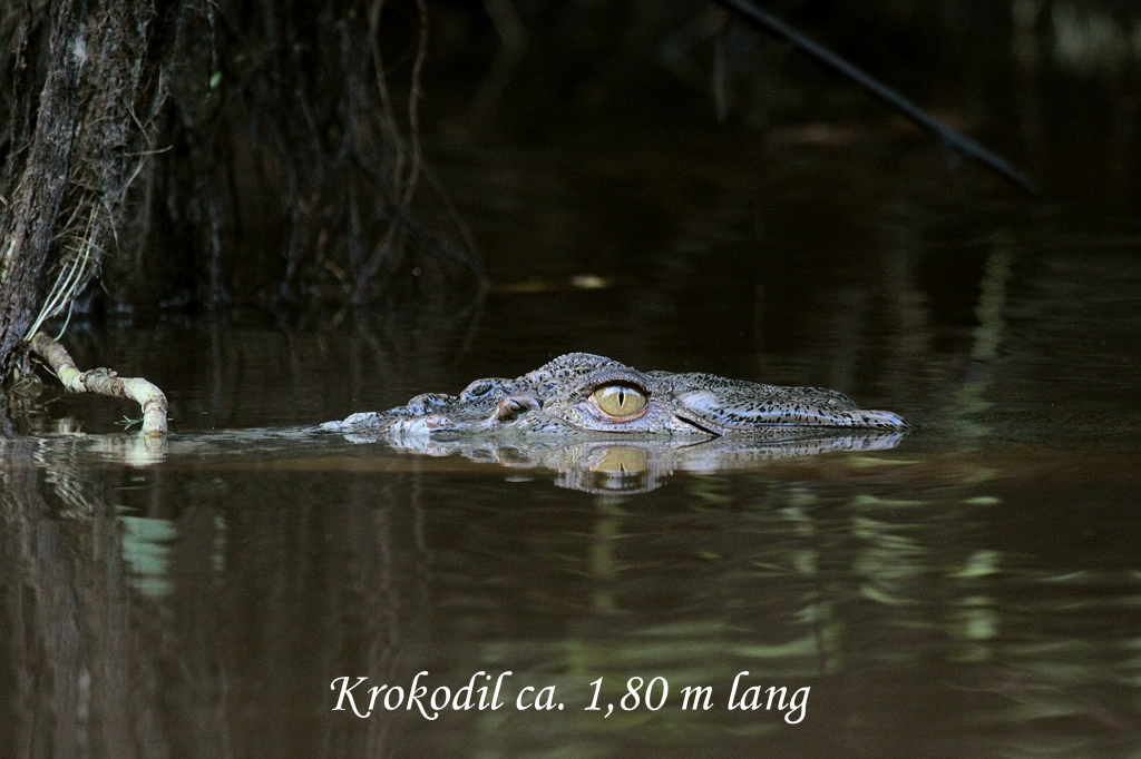 Wir sahen auf der Fahrt: einige Purple Heron, Common Pied Fantail (sein kleines Nest war geschickt an einem Schilfhalm befestigt), eine erste Gruppe Proboscis Monkeys (Nasenaffen), Nester mit brütenden House Swifts und Mossy-nest Swiftlets (zwei Seglerarten), Storm Stork, eine Gruppe Long-tailed Makaken, Pied Hornbill und Black Hornbill. Hoch in einem Baumwipfel machte uns Jamil auf ein Nest aufmerksam, in dem sich gerade ein Orang Utan zur Nachtruhe niedergelassen hatte. Dabei sah man nur noch einen braunen Arm aus dem Nest hängen. Auf einem Baum saßen 4 Bushy-crested Hornbills. Plötzlich zeigte Jamil aufgeregt Richtung Ufer. Er hatte ein riesiges, mindestens 4 m langes, Krokodil entdeckt, dessen Kopf ein wenig aus dem Wasser ragte. Es lauerte offensichtlich darauf, vielleicht einen Hund oder ein ähnliches Tier beim Wasser Trinken zu fangen. Die Stelle war unmittelbar bei einer Bed-and Breakfast Unterkunft. Na ja, schwimmen möchte ich da nicht. |