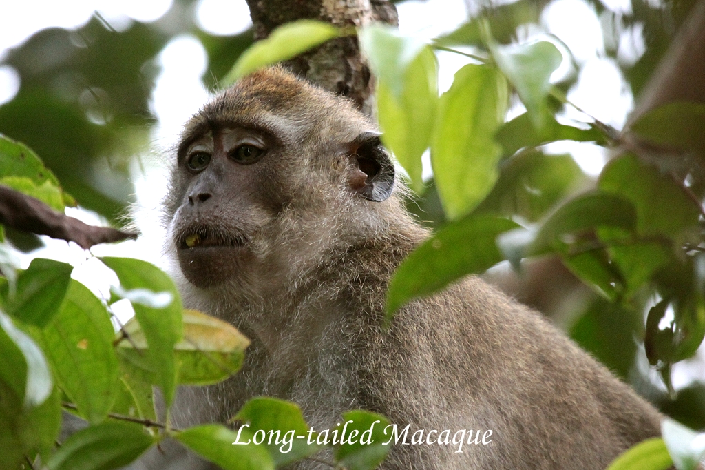 2 Long-tailed Makaken turnten in den Mangroven. Weiter sahen wir: noch einen Blue-eared Kingfisher, Drongo, einige Long-tailed Parakeets überflogen uns, Asian Paradise Flycatcher (m und f), 4 kleine Crimson (???) Sunbirds , Monitor Lizard auf Baum, Ashy Tailorbird, verschiedene Bulbuls, Lesser Fish Eagle, Imperial Pigeon, Prevost's Squirrel, Oriental Darter, White-crowned Shama, Pygmy Squirrel. |