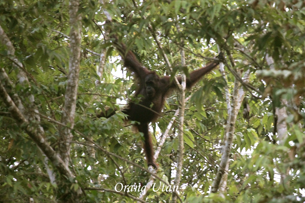 Heute Morgen hatte man wohl vergessen uns zu wecken, jedenfalls wurde Tomoko um 5:50 Uhr wach, weil ein Hahn krähte und es langsam hell wurde. Schnell zogen wir uns an, ich trank noch einen Kaffee und dann schnell zum Boot. Um 6:15 Uhr fuhren wir ab wiederum stromaufwärts. Als erstes begrüßte uns ein White-bellied Sea Eagle von einem hohen Baum. Dann in schneller Folge: Purple Heron, Little green Pigeon, Greater Coucal, Bar-winged Flycatcher Shrike, Common Kingfisher. Ein einzelner männlicher Proboscis Monkey saß auf einem Baum, drehte uns aber unhöflicherweise seinen Rücken zu. Ein junger Stork-billed Kingfisher kreuzte unseren Weg. Dann entdeckte ich mit meinem Fernglas einen Orang Utan in den Bäumen klettern. Wir fuhren nahe heran. Es war ein männlicher, schon ziemlich alter, der sich da von Baum zu Baum hangelte. |