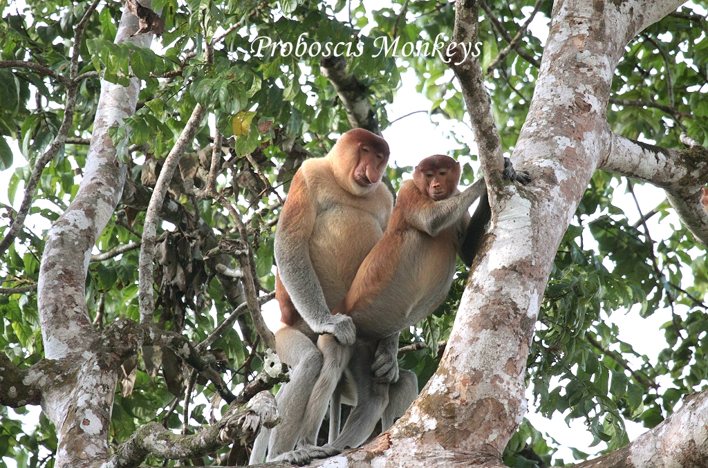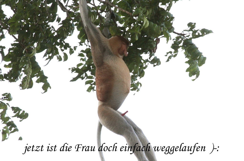 Doch mit viel Geduld schafften es schließlich alle einer nach dem anderen nach insgesamt 20 min Suche einen Blick auf das Tier zu werfen. Wir fuhren wieder zurück zum Kinabatangan River. Nach kurzer Zeit sahen wir auf der anderen Flussseite eine ganze Gruppe Proboscis Affen durch die Bäume turnen. Ein etwa 20 Jahre altes großes Männchen mit kräftig ausgebildeter Nase trohnte hoch in einem Baumwipfel. Als ein weibliches Tier bei ihm vorbei wollte, erhob er sich plötzlich und begann ein längeres Liebesspiel. |