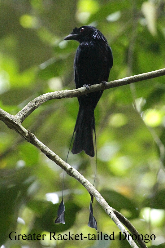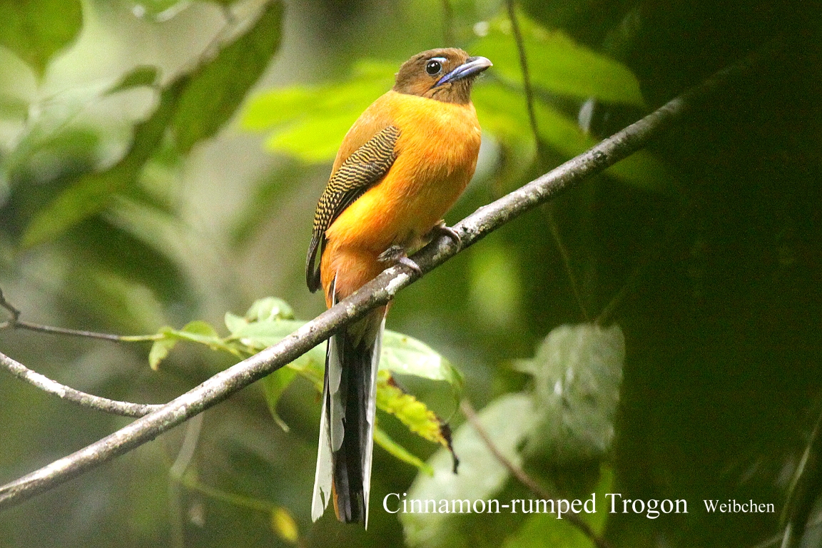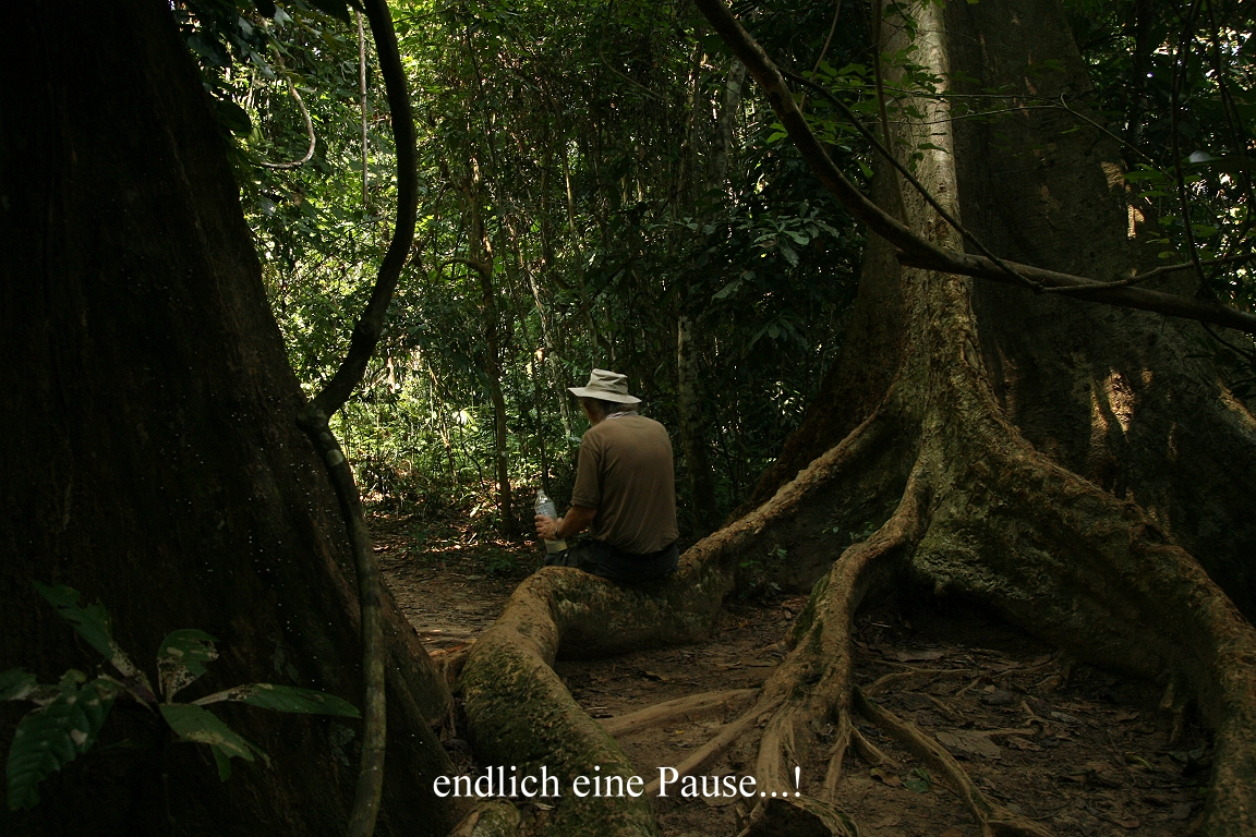 Hier waren plötzlich unglaublich viele Vögel zu sehen und zu hören. Tomoko meinte scherzhaft, dass ihr gesamtes Vogelbuch hier vorhanden zu sein schien. Wir wussten gar nicht, wo wir zuerst hinschauen sollten. Die Liste der Vögel, die wir hier beobachten konnten, ist ziemlich lang: Fiery Minivet, Black-naped Monarch, Ruby-cheeked Sunbird, Bronzed Drongo, Lesser Racket-tailed Drongo, Buff-Rumped Woodpecker, Raffle's Malkoha, Asian Paradise Flycatcher, Spiderhunter, Lesser Cuckooshrike, Chestnut-winged Babbler, Rufous-winged Philentoma, White-rumped Shama. Plötzlich entdeckte Tomoko in den Zweigen einen Vogel mit leuchtend rotem Bauch. Beim näheren Hinsehen konnten wir ihn als Scarlet-rumped Trogon identifizieren, ein wirklich wunderschöner und ziemlich seltener Vogel. Wir blieben etwa eine halbe Stunde an dieser Stelle stehen und freuten uns über unser Glück, hier plötzlich mitten im Urwald so viele schöne und teilweise seltene Vögel beobachten zu können. Da wir uns beide heute konditionell in recht guter Verfassung fühlten, beschlossen wir, dem Weg weiter zu folgen und nicht wie vor drei Tagen zurückzugehen. Zunächst aber setzten wir uns auf einen Baumstamm, aßen ein paar Currypaps und tranken viel Wasser dazu. Auch wenn wir meistens im Schatten des Dschungels wanderten, so war es doch sehr heiß und schwül, so dass mein hellbraunes T-Shirt vor Nässe inzwischen komplett dunkelbraun war. |