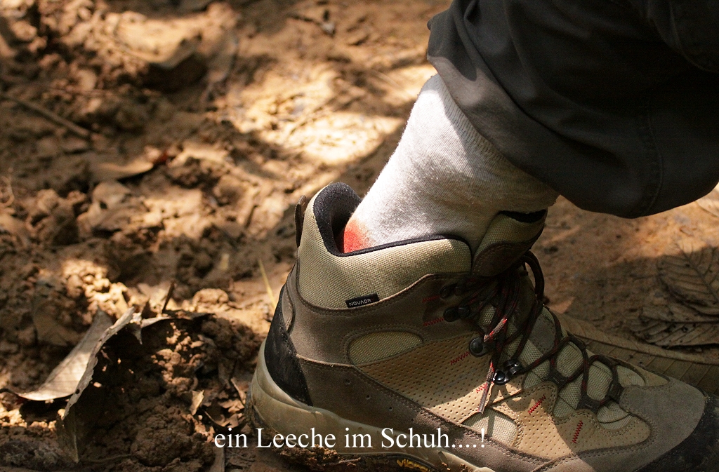 Plötzlich entdeckte ich, dass mein rechter Socken von Blut durchtränkt war. Hatte es doch tatsächlich einer dieser Leeches wieder geschafft! Langsam gingen wir weiter. Aus der Ferne hörten wir immer wieder die Stimme des Garnet Pitta, ein wunderschöner, aber sehr seltener und schwer zu beobachtender Vogel. Leider ließ er sich nicht blicken. |