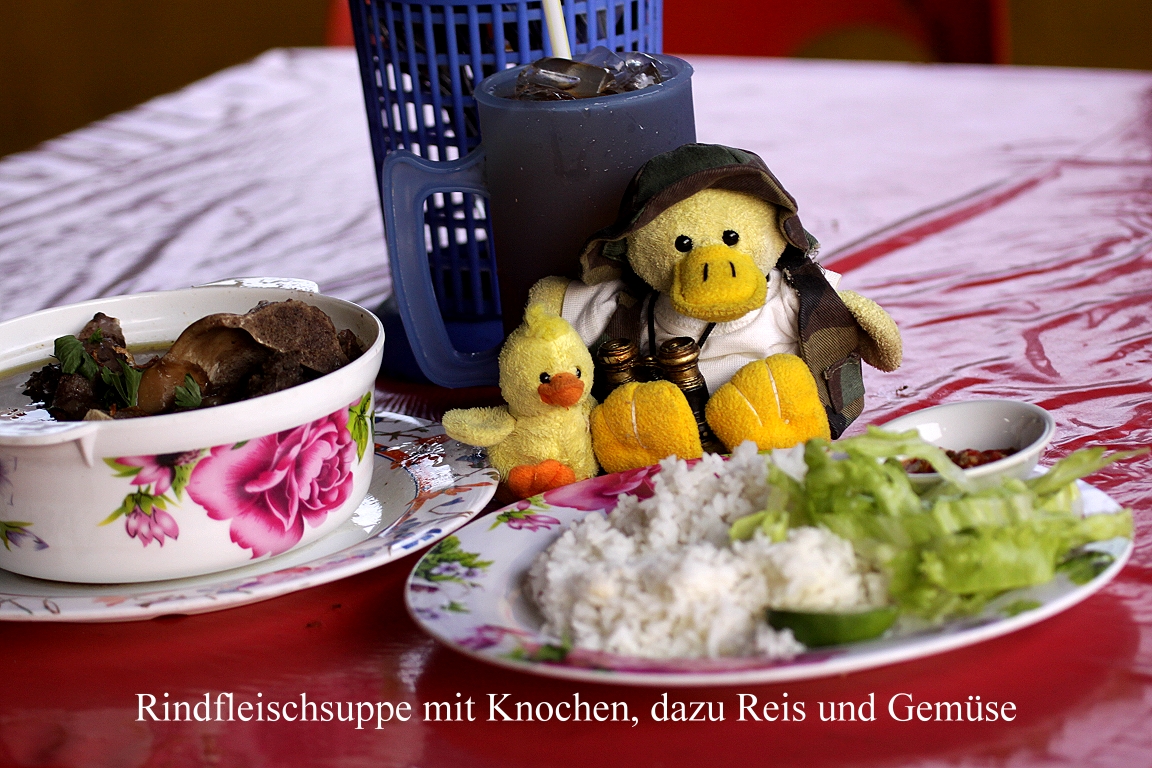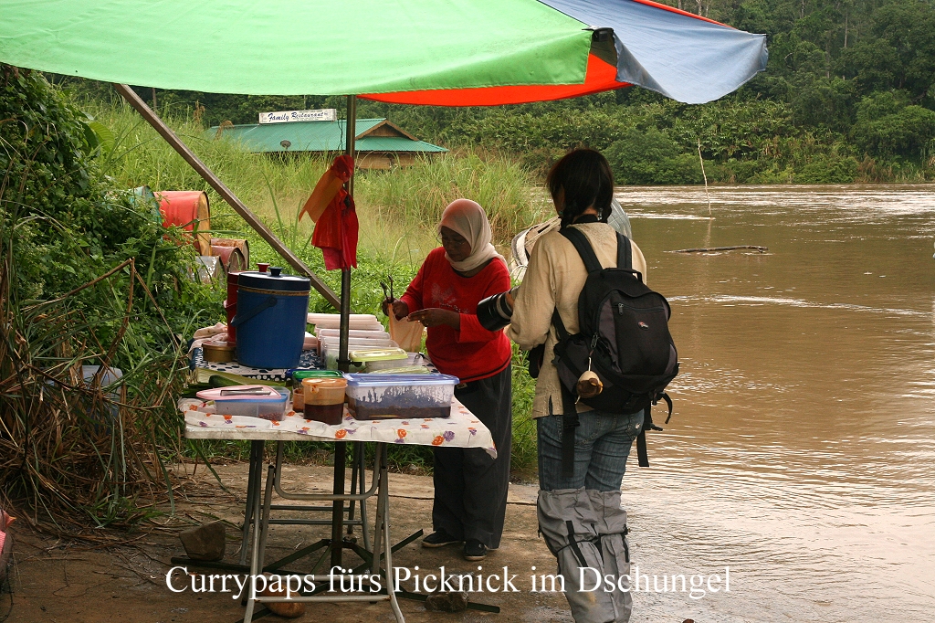 Ich wurde um 7:10 Uhr war, während Tomoko schon aufgestanden war. Das Frühstück um 7:30 Uhr war heute viel besser, da es kein Buffet gab, sondern für jeden Gast frisch gebratene Nudeln mit Rührei sowie Toast mit Butter und Marmelade. Fünf Falconets saßen wieder in ihrem Baum, ebenso der White-bellied Kingfisher. Ein Pied Hornbill flog gerade weg. Nach dem Frühstück packten wir wie immer unsere Rucksäcke, fuhren mit dem Auto zum Fluss, wo Tomoko an ihrem Lieblingsverkaufsstand die letzten neun Currypaps kaufte. |
