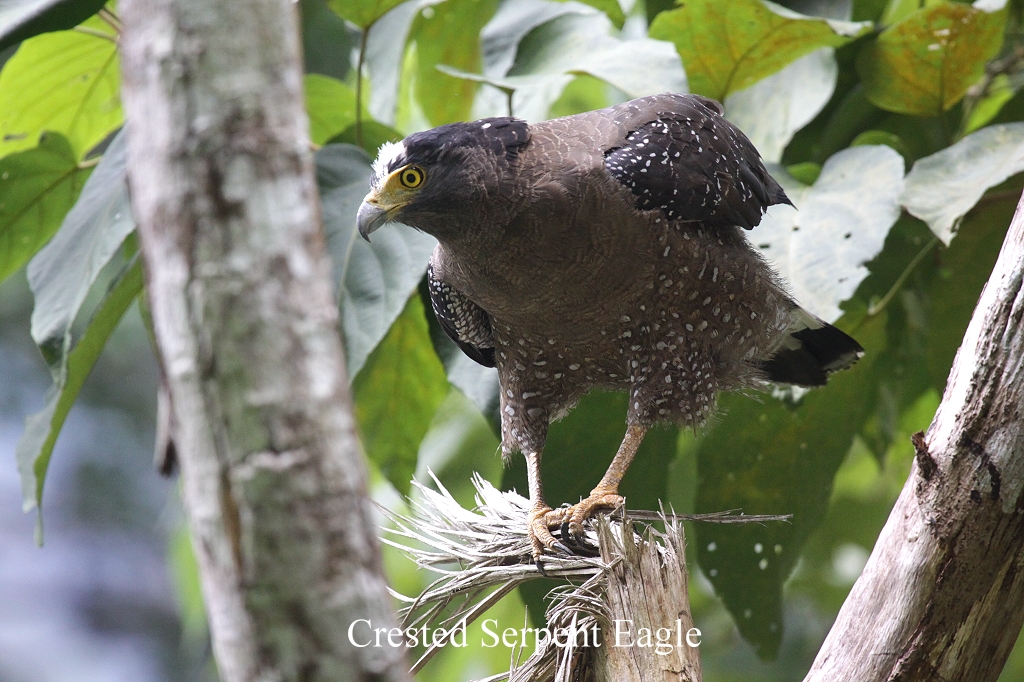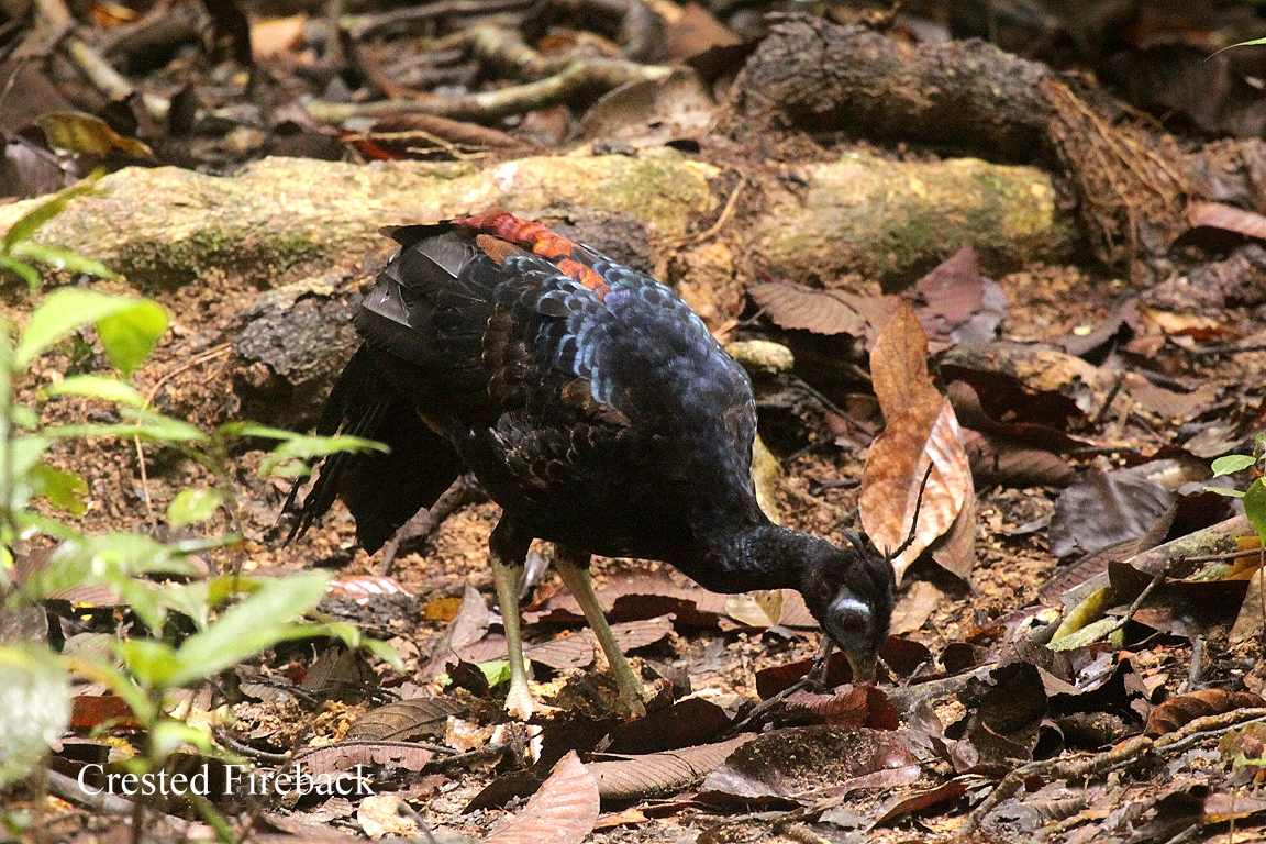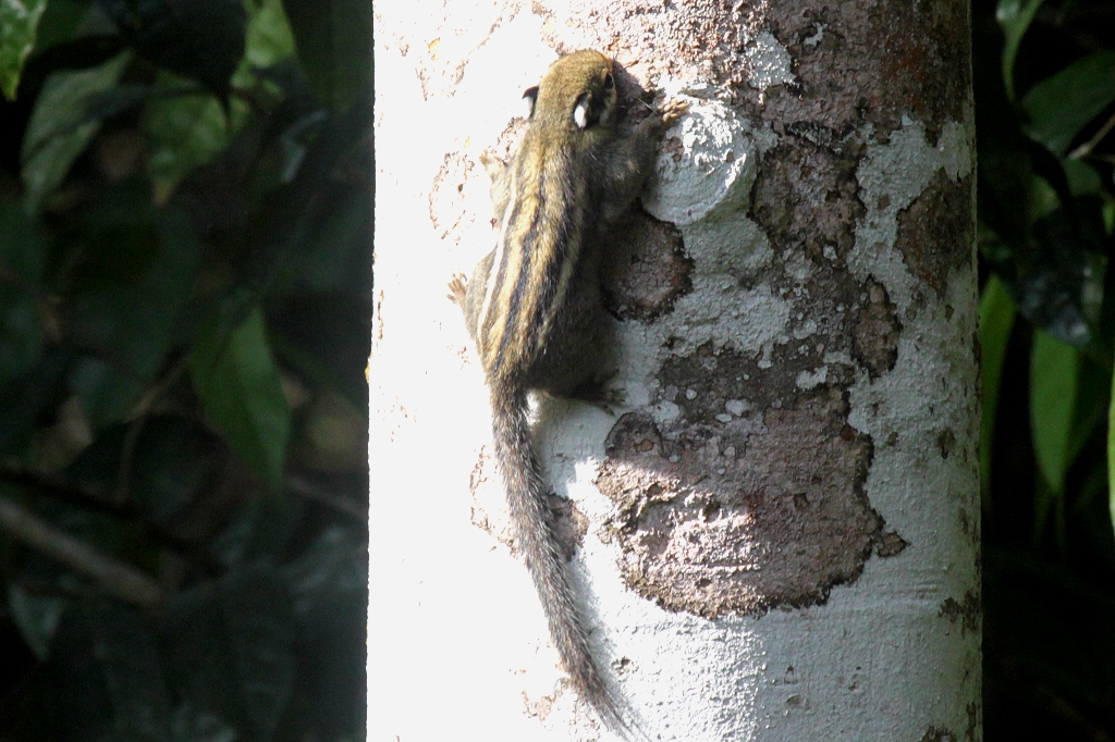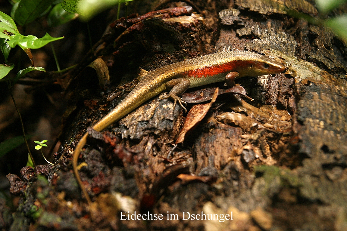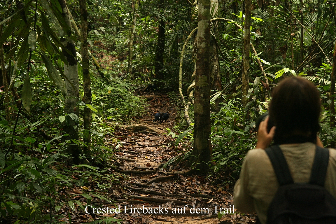 Wir gingen weiter und plötzlich tauchten wie aus dem Nichts sechs oder sieben Crested Firebacks aus dem Unterholz auf und kamen uns langsam auf dem Trail entgegen. Sie waren einige Minuten zu sehen und verschwanden dann lautlos wieder im Dschungel. Kurz vor dem kleinen Bach konnten wir drei oder vier Babblers (Black-throated) beobachten. Hier hatte sich am Boden eine große Wasserlache gebildet. In diese stellte ich mich und war so vor den Leeches sicher !!! Da wir etwas Hunger verspürten, setzten wir uns 20 min auf einen umgefallenen Baumstamm und aßen unsere Currypaps und die süßen, mit Kokosnuss gefüllten Paus. Eine schöne Eidechse tauchte auf einem Baumstumpf |