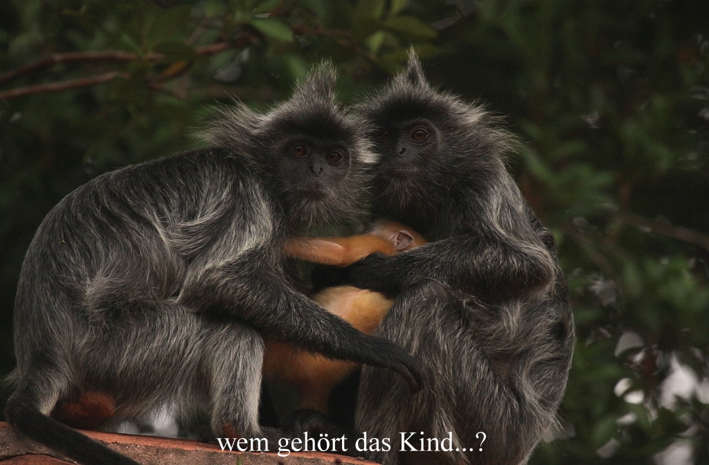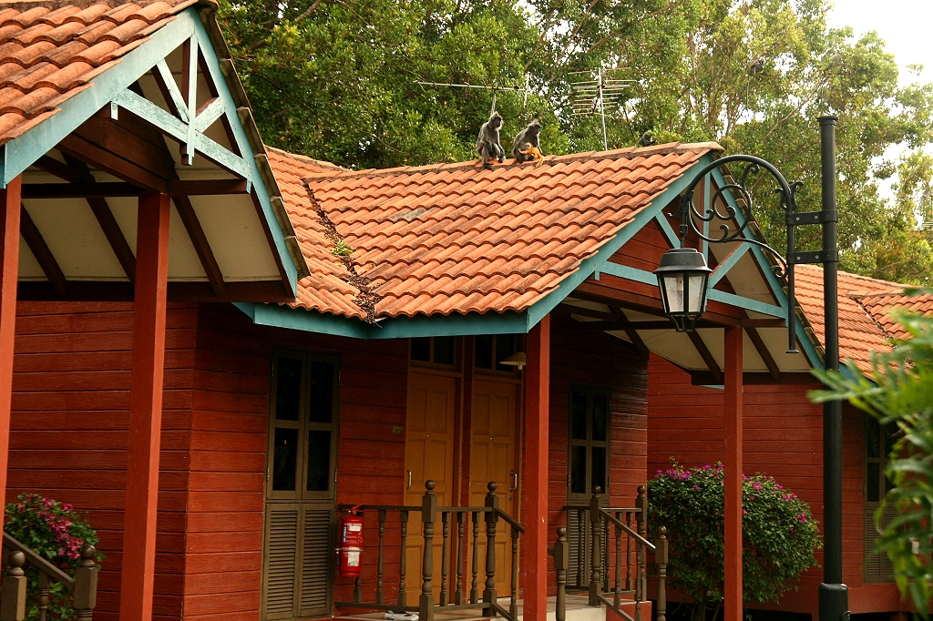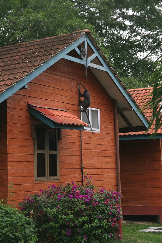Wir konnten beobachten wie eine ganze Herde Affen von den Bäumen auf ein Chaletdach sprang und von dort mit weiten Sprüngen auf die nächsten Chalets. Manche liefen auch am Boden herum und kletterten geschickt und sehr schnell an den Chalets empor. Einige weibliche Tiere hatten ihre Jungen dabei, die sich bei den großen Sprüngen sicher am Fell der Mutter festhielten. Das sah schon sehr sportlich aus. |