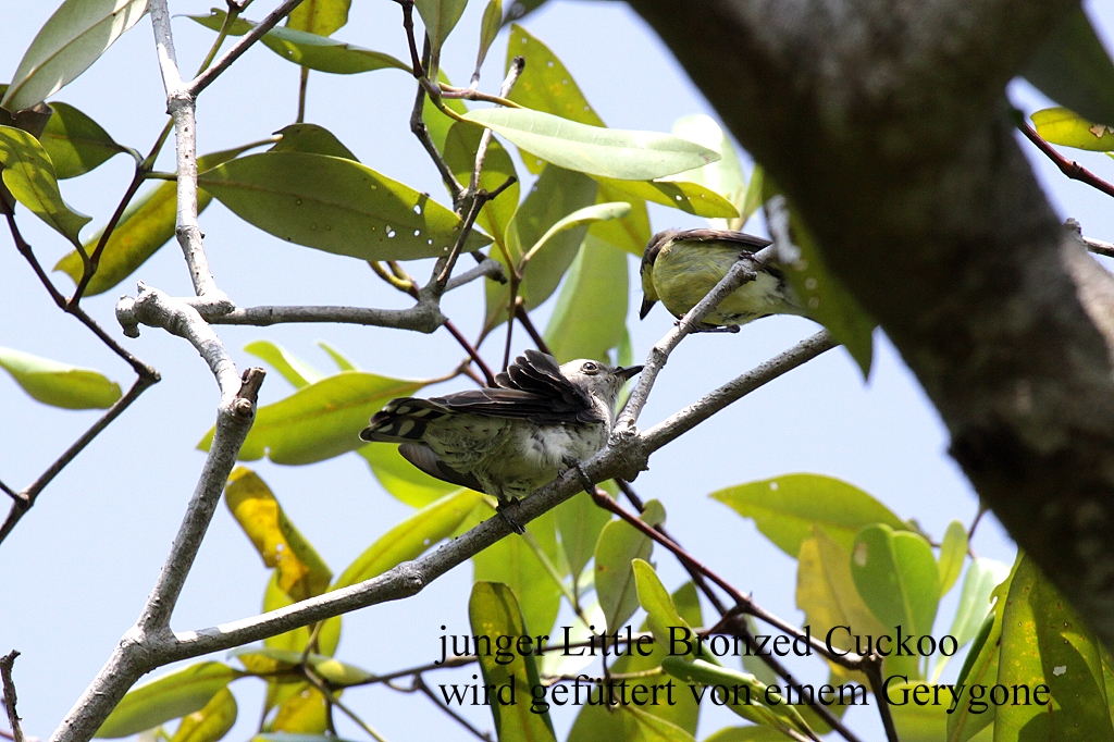 Ein junger Kuckuck (Little Bronze Cuckoo) wurde von einem viel kleineren Gerygone gefüttert. In unmittelbarer Nähe saßen zwei Sacred Kingfishers. Links vom Trail, in einem flachen kleinen See, kämpften zwei Schlammspringer miteinander, gleich daneben schwamm ein Monitor Lizard langsam durch das trübe Wasser. Ein Yellow Iora suchte in einer Mangrove nach Futter. Wir kamen an eine Stelle, wo ein begehbarer, aus Beton gemachter Steg weiter in die Mangroven hinein führte und etwa 100 m vor der Küste endete. Hoch auf einem Baum entdeckte ich einen Bronzed Drongo. Plötzlich erschallte aus dem dichten Mangrovengebüsch in unserer Nähe ein für uns neuer Vogelruf. Gleichzeitig hörten wir ein Klopfen, wie von einem Specht. Das klopfende Geräusch kam vom Boden. Minutenlang versuchten wir mit unseren Ferngläsern, in den dichten Mangroven etwas zu erkennen. Nach langem Suchen entdeckten wir endlich den Vogel. Es war tatsächlich ein Specht, ein weiblicher Laced Woodpecker. Beim näheren hinsehen bemerkten wir noch einen zweiten, einen männlichen mit leicht roter Haube. Wir blieben eine ganze Weile stehen und beobachteten die Szene. Wie auf ein Kommando flogen die Spechte plötzlich mit einem lauten Schrei weg und wir stellten fest, dass es sich um insgesamt vier Spechte handelte. |